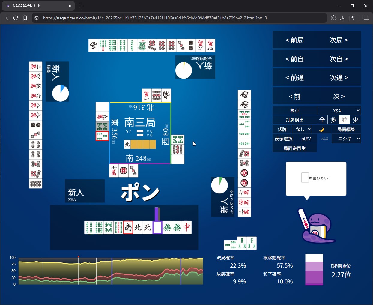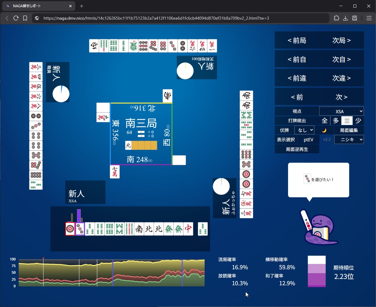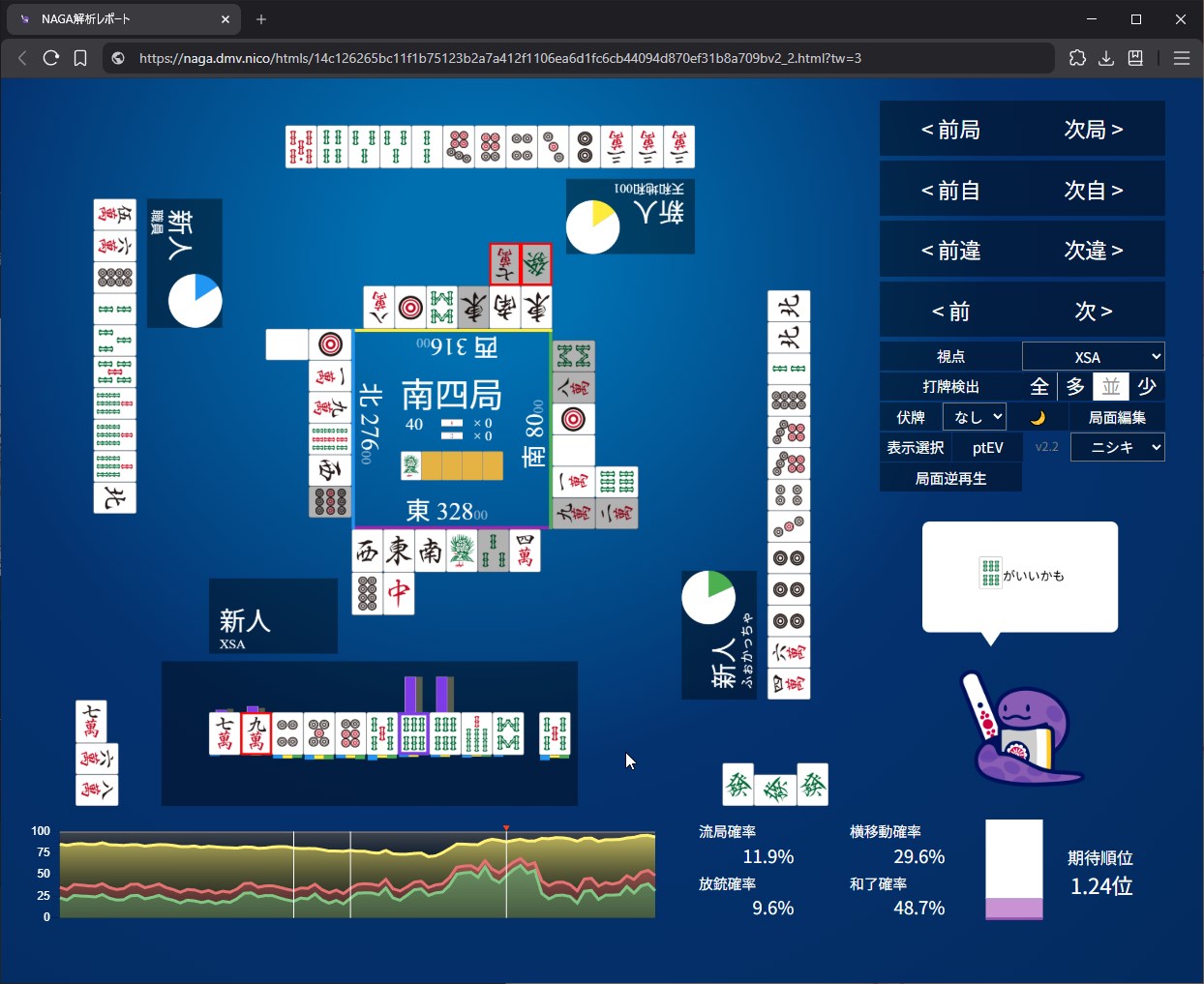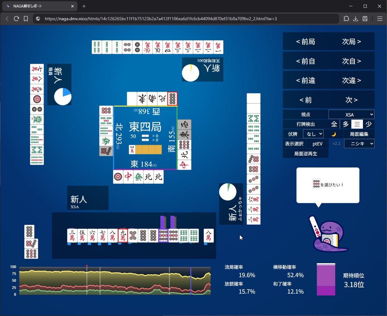 I dont think I’m folding yet so 8p vs 9s is the debate. The early 4p and my ability to see 3 8s makes me think 9s is safer to discard (Naga feels the same) but dumping 8p seems too risky here to me (I would put the tenpai it on 58p or 69p based on the early 4p discard)