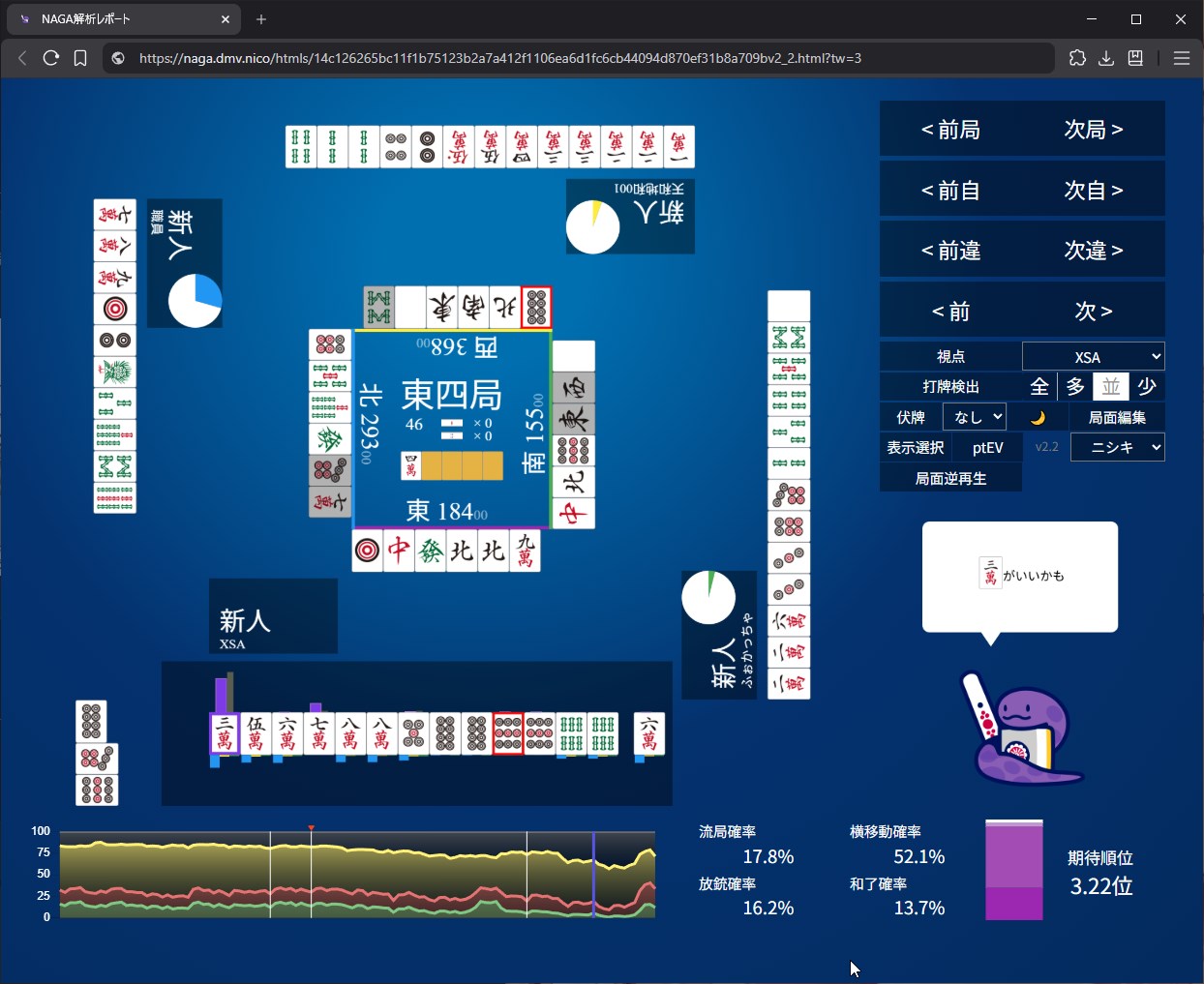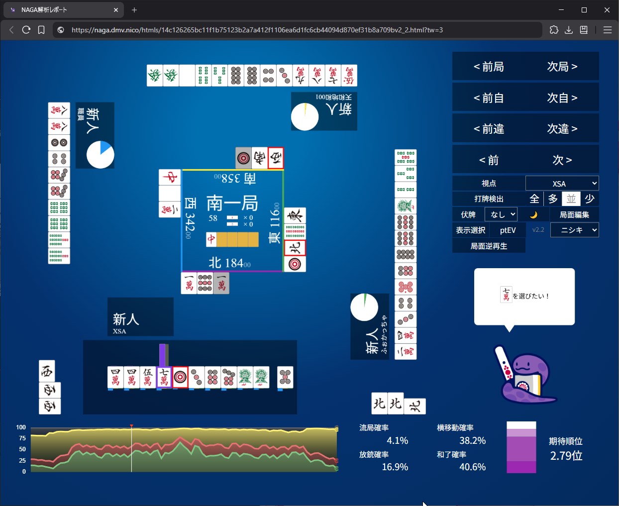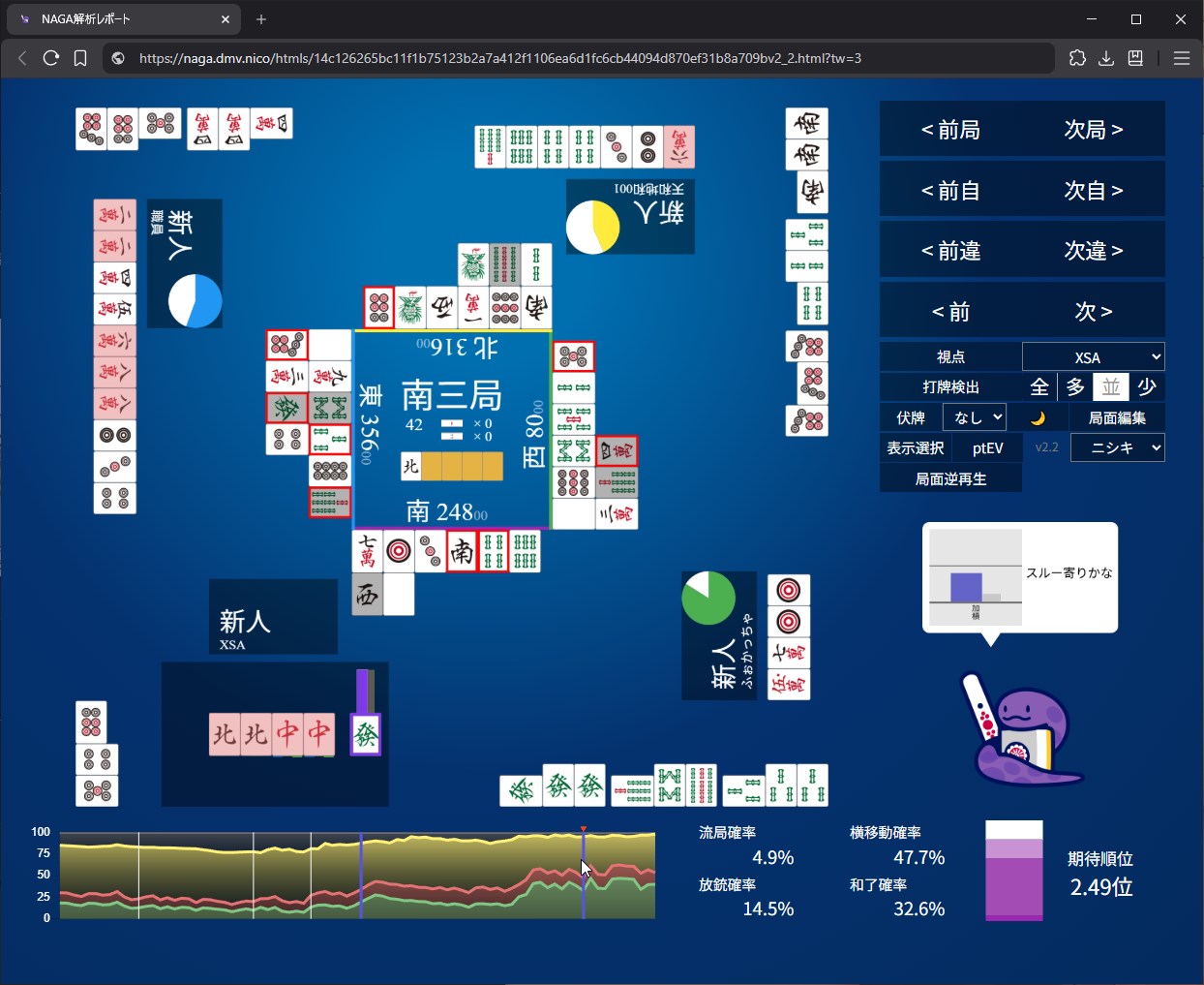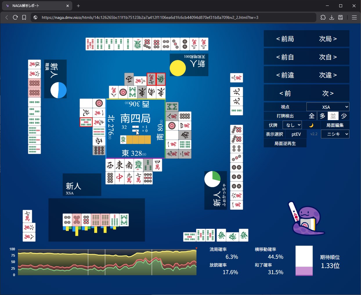 I dont think I’m folding yet so 8p vs 9s is the debate. The early 4p and my ability to see 3 8s makes me think 9s is safer to discard (Naga feels the same) but dumping 8p seems too risky here to me (I would put the tenpai it on 58p or 69p based on the early 4p discard)