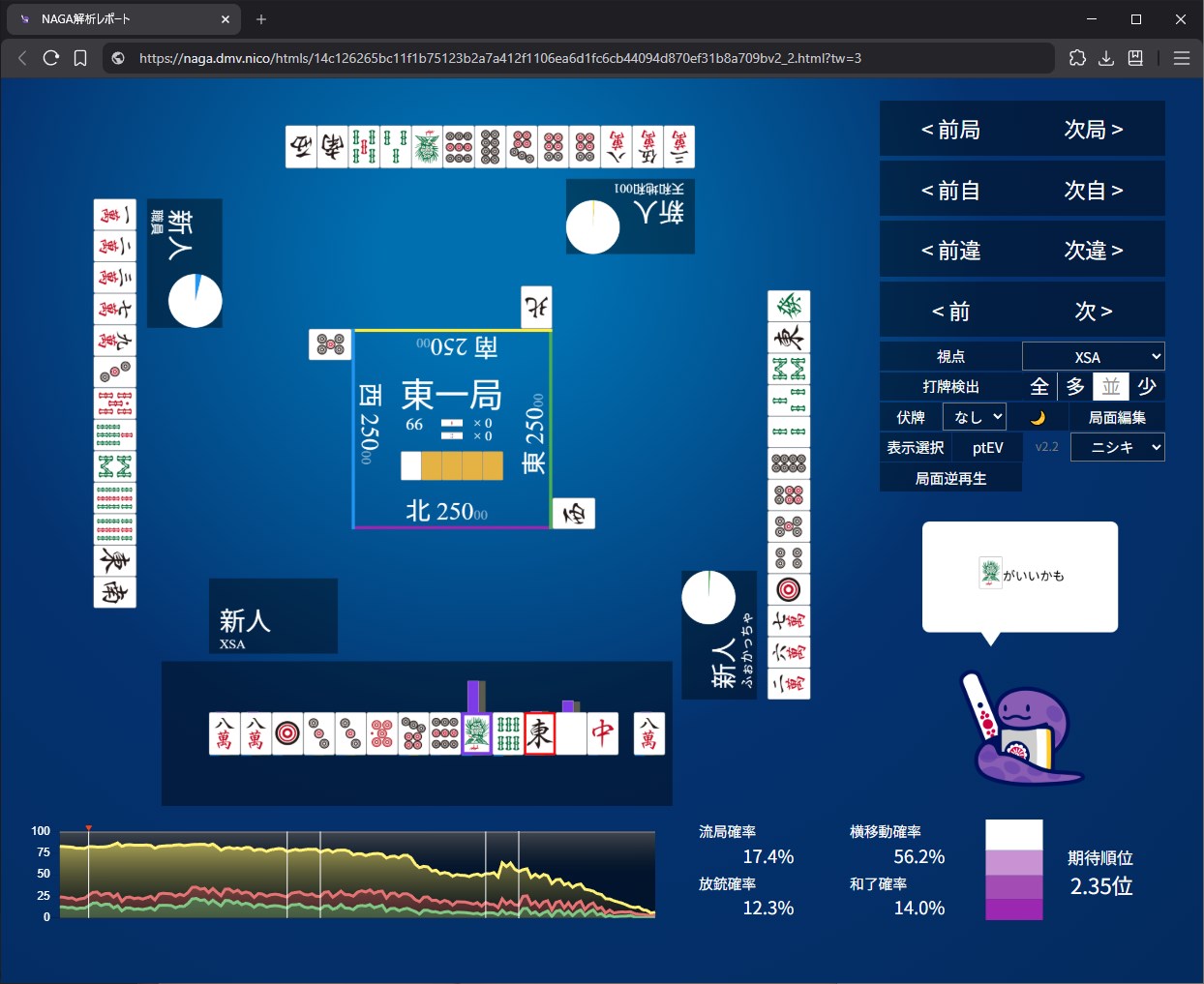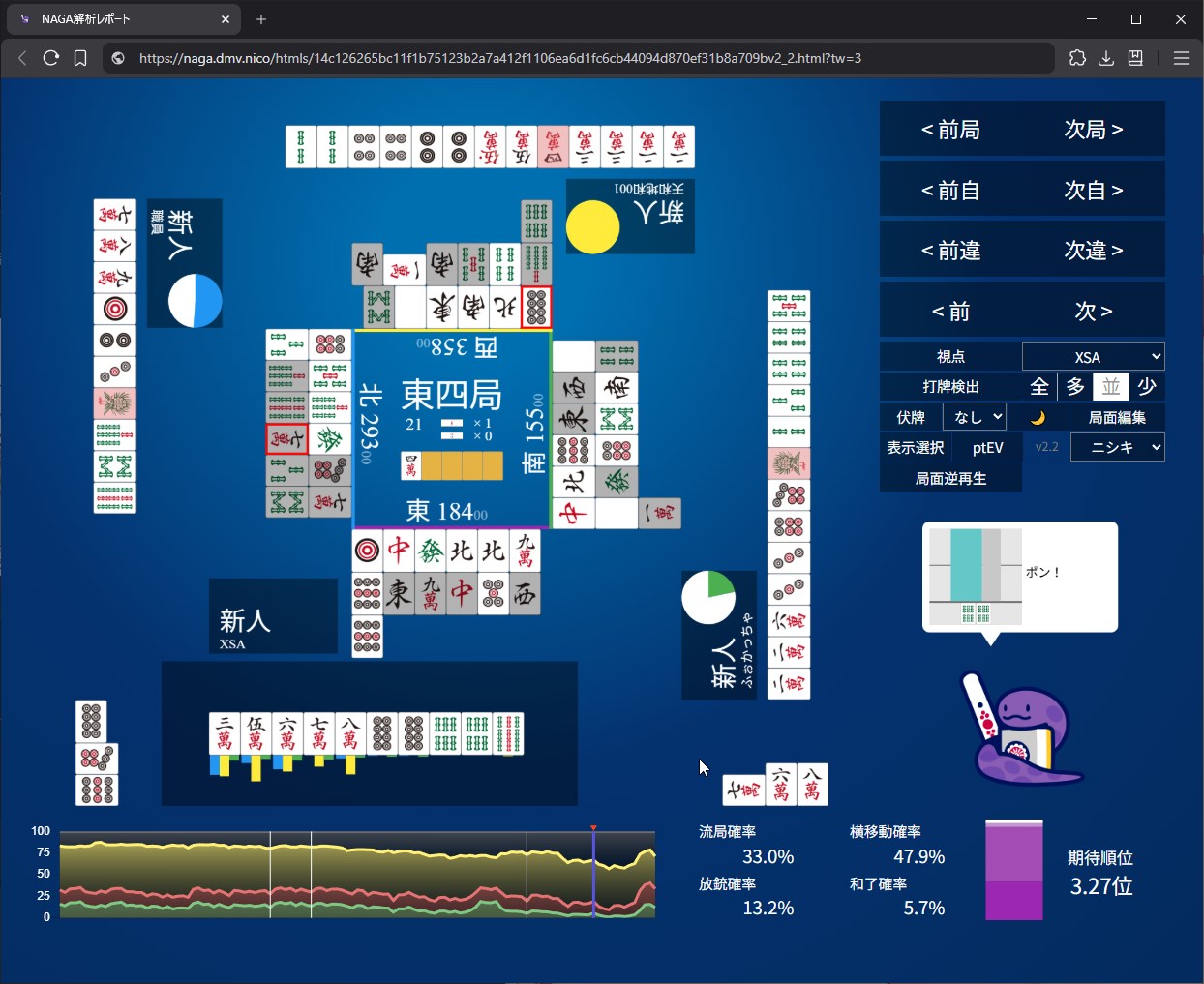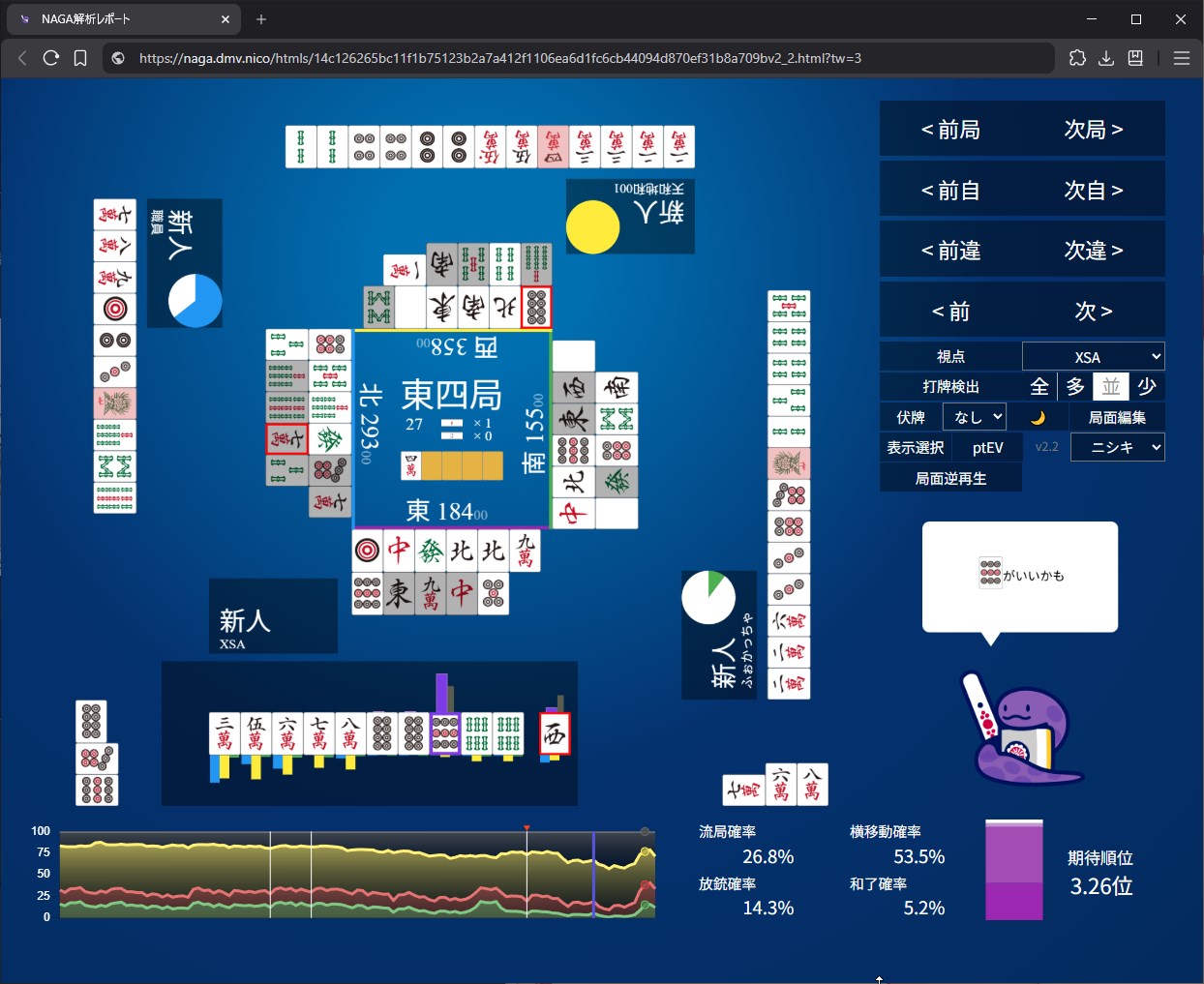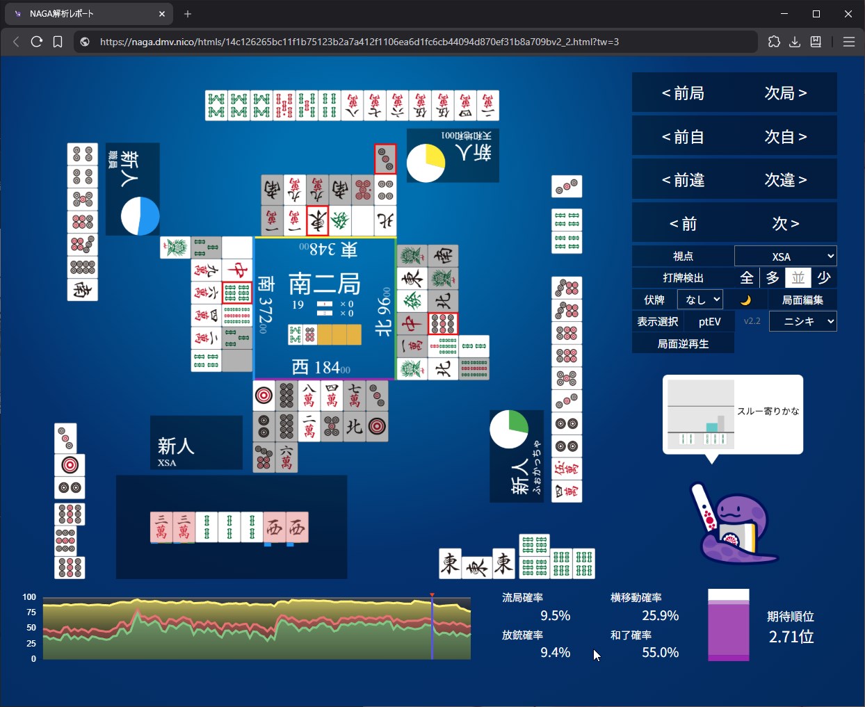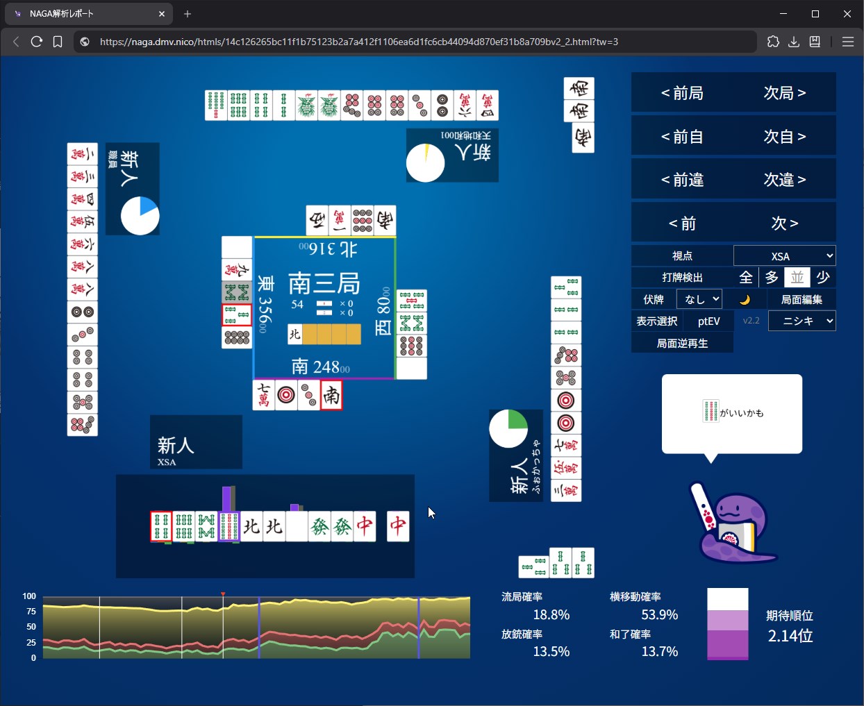 I dont think I’m folding yet so 8p vs 9s is the debate. The early 4p and my ability to see 3 8s makes me think 9s is safer to discard (Naga feels the same) but dumping 8p seems too risky here to me (I would put the tenpai it on 58p or 69p based on the early 4p discard)