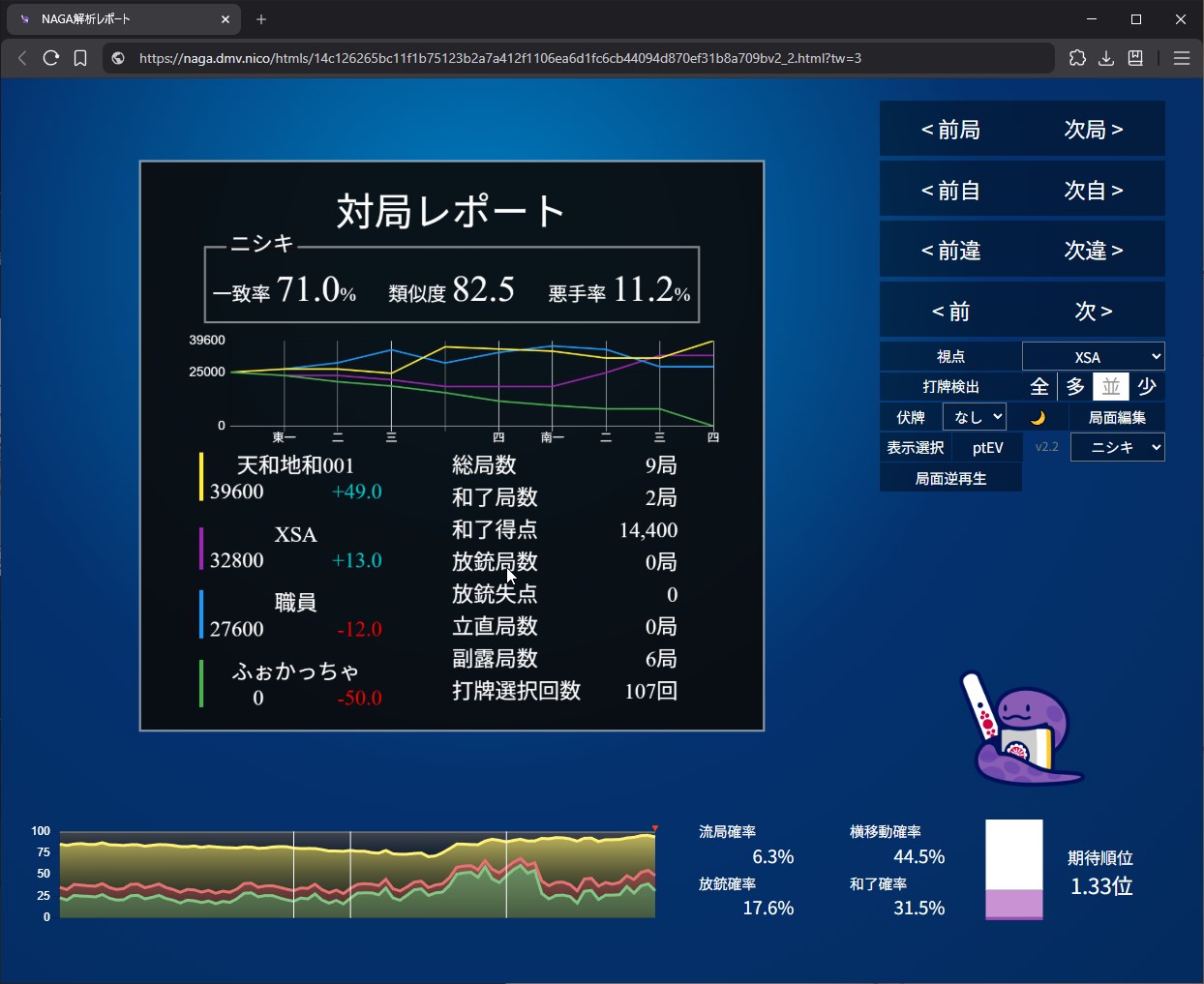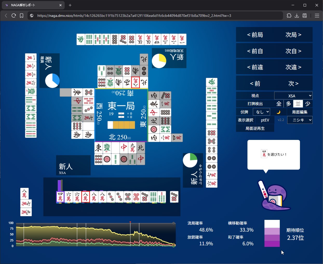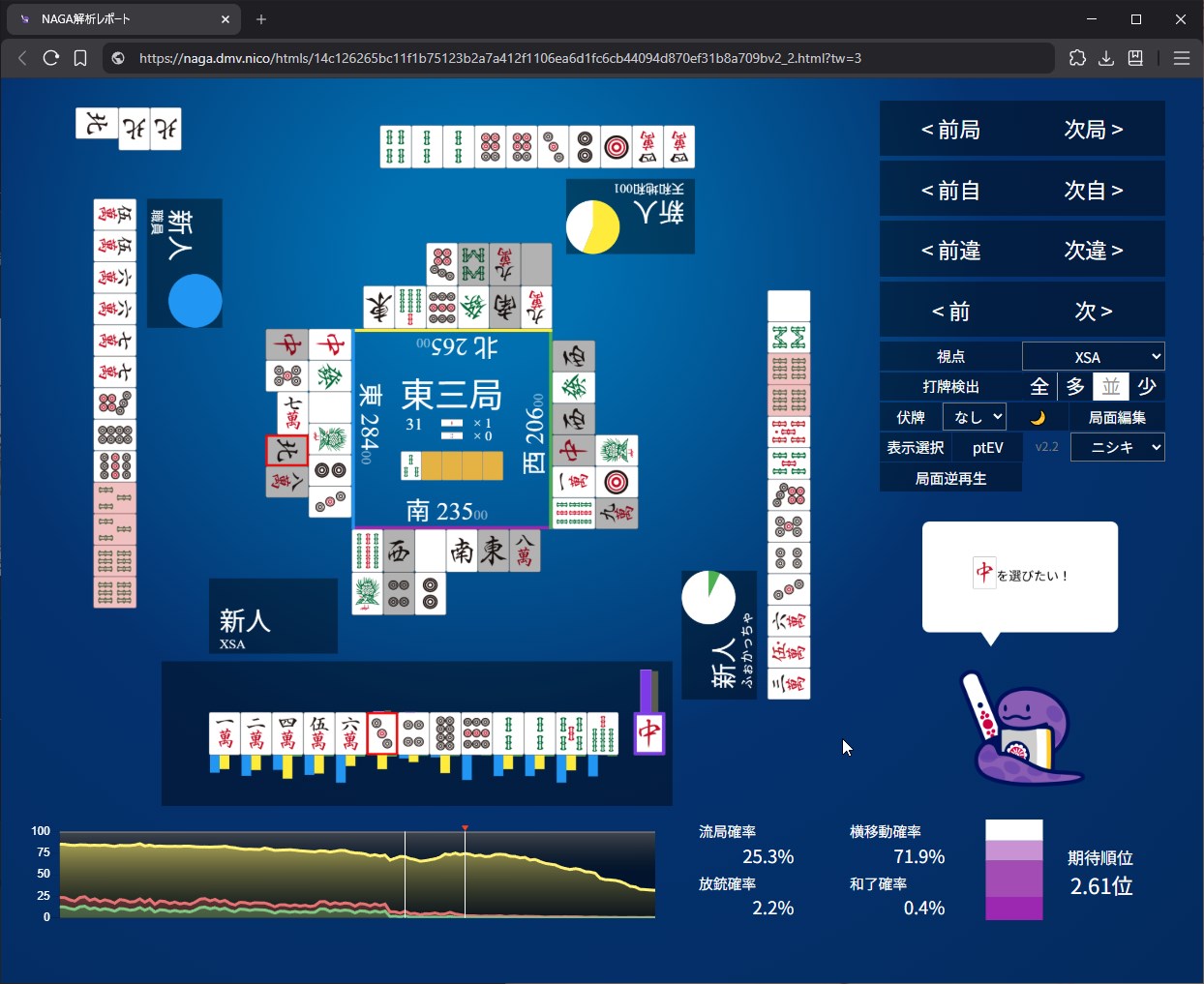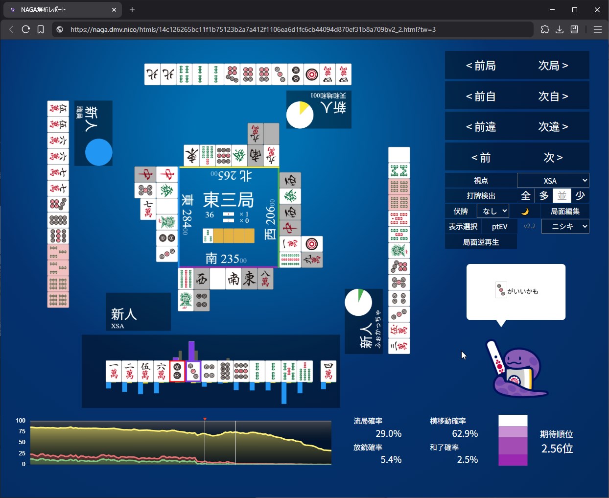 I dont think I’m folding yet so 8p vs 9s is the debate. The early 4p and my ability to see 3 8s makes me think 9s is safer to discard (Naga feels the same) but dumping 8p seems too risky here to me (I would put the tenpai it on 58p or 69p based on the early 4p discard)