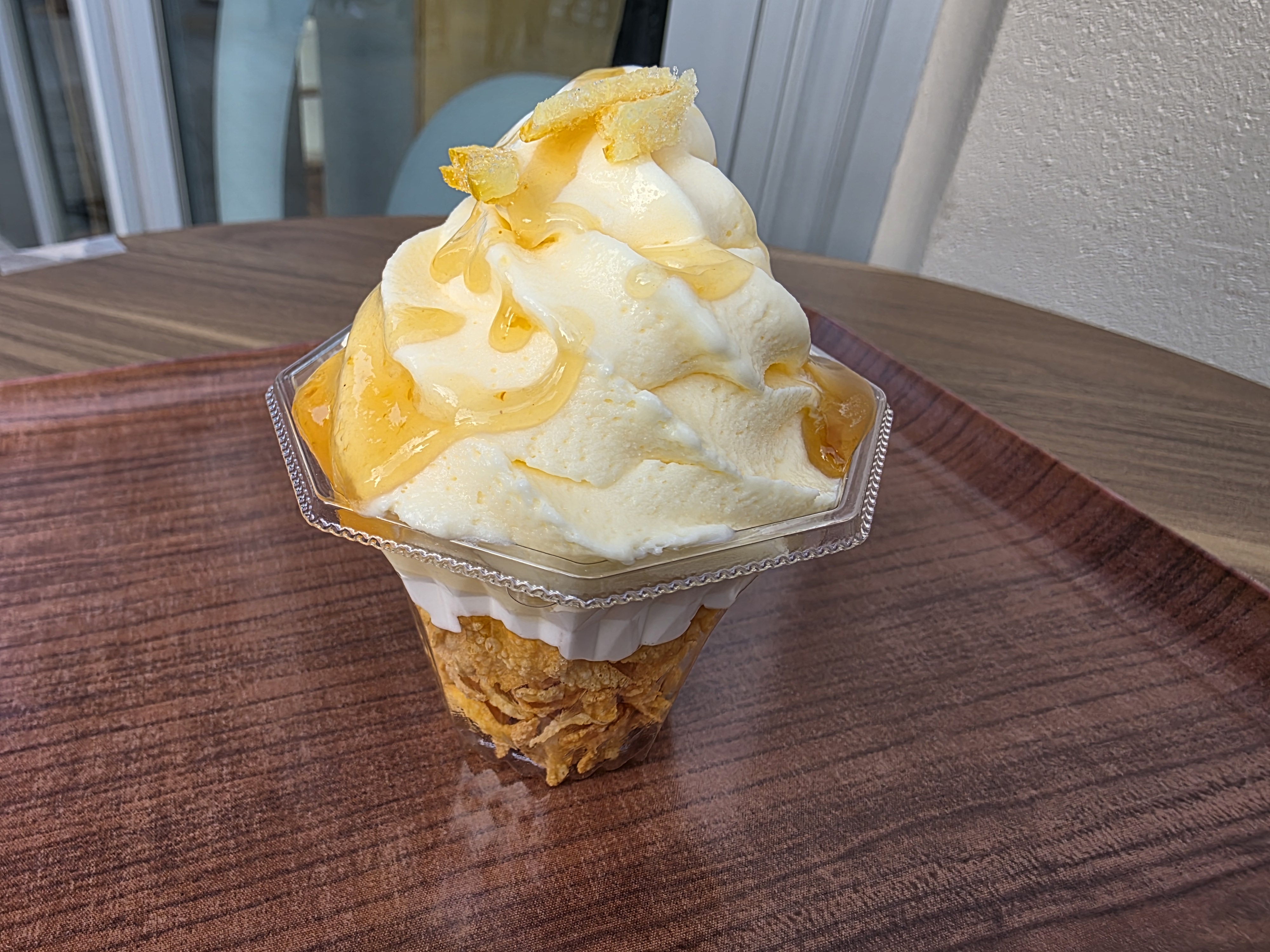 It’s corn flakes on the bottom, soft serve with yuzu syrup and candied yuzu peel. I quite like it a lot, but it’s really expensive at 850 yen for the little cup. Worth trying once, but probably not more than that.
