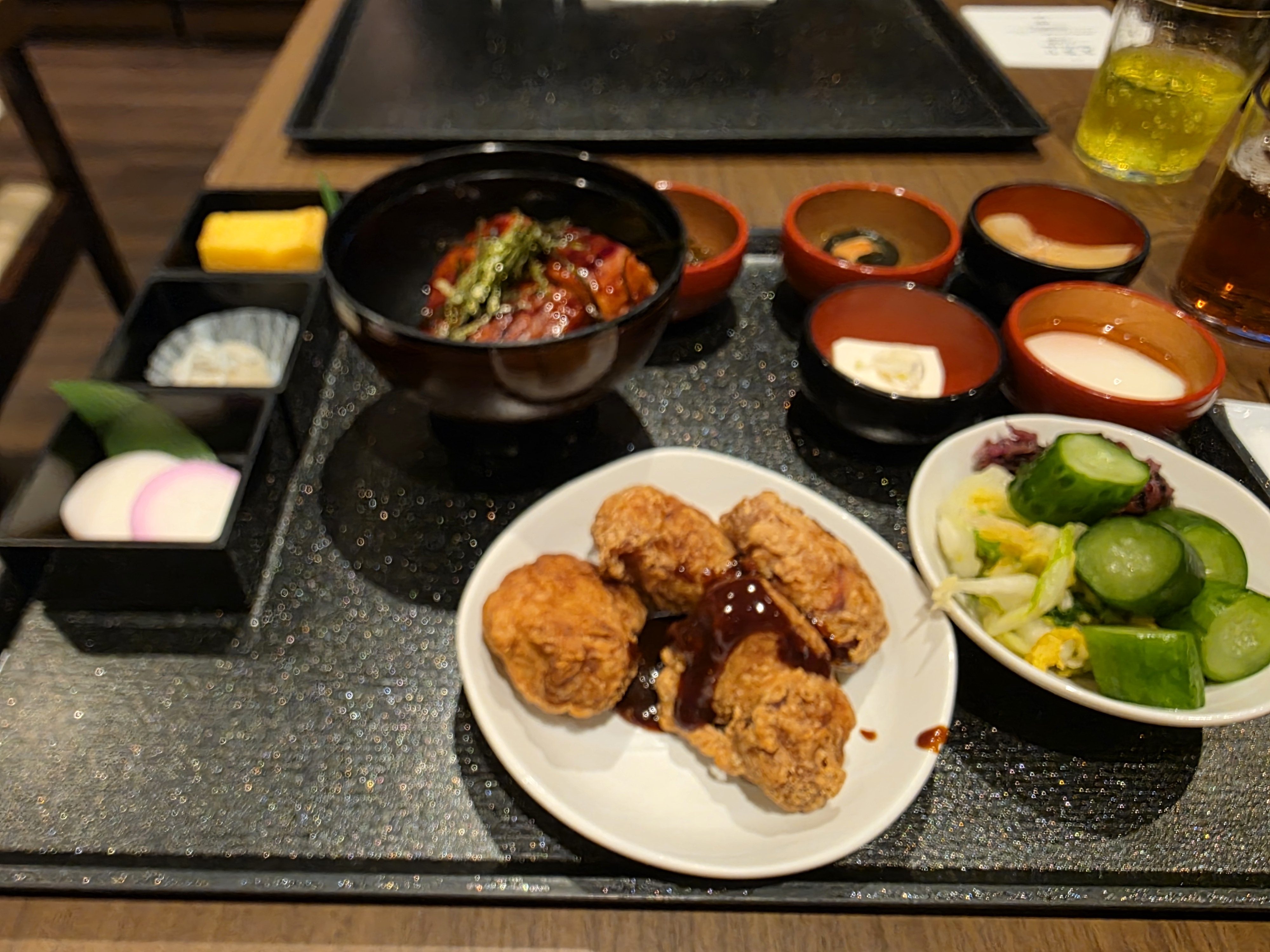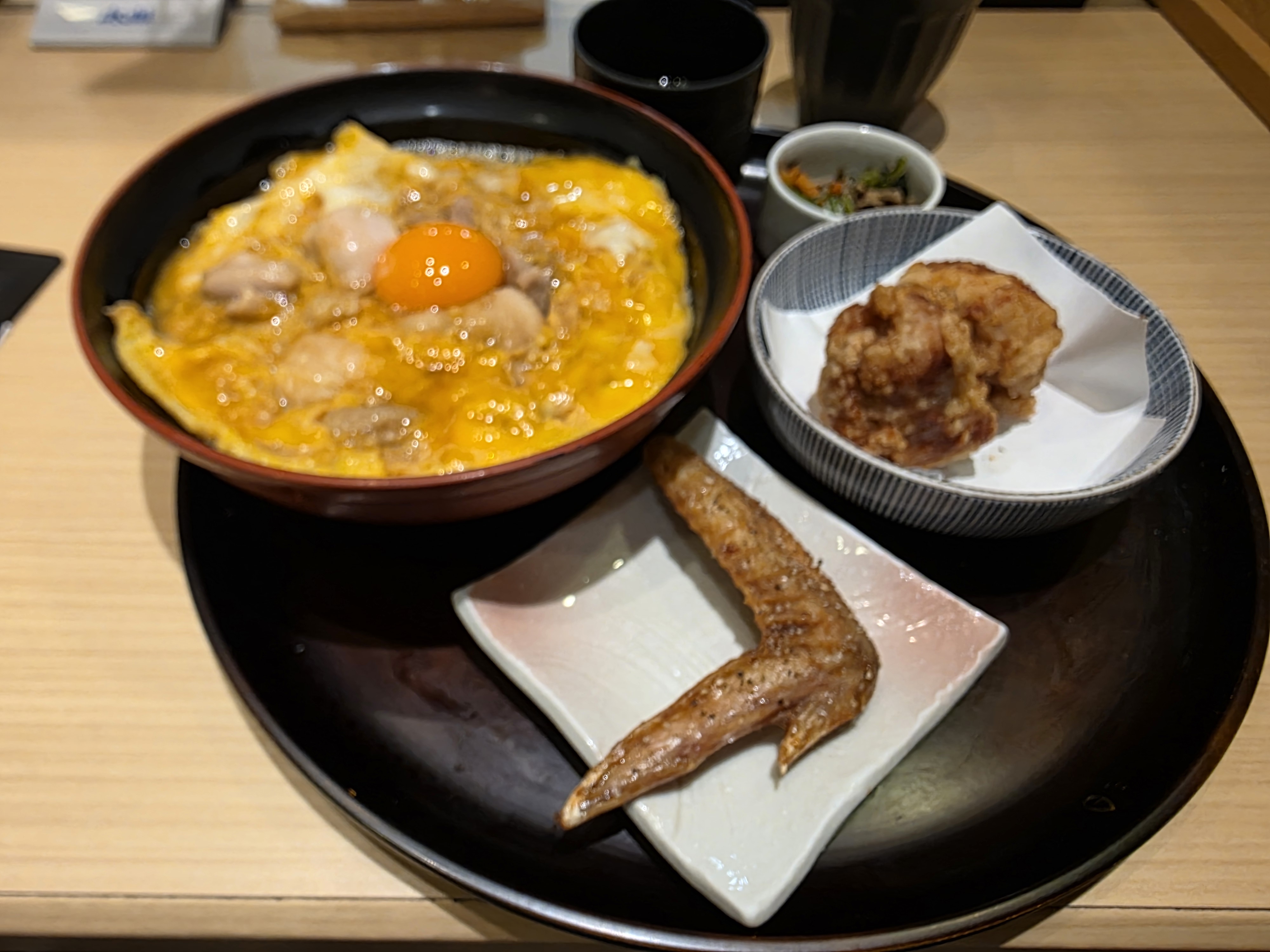 We have an oyakodon, fried chicken, and a tebasaki chicken wing. The Chicken is slightly undercoocked, most likely to let the natural flavor of the chicken come through along with presumably cochin chicken eggs: very runny and slimy – I like it, but I know some might not. Chicken wing has a good seasoning on the exterior and the fried chicken was the best part being piping hot and moist.