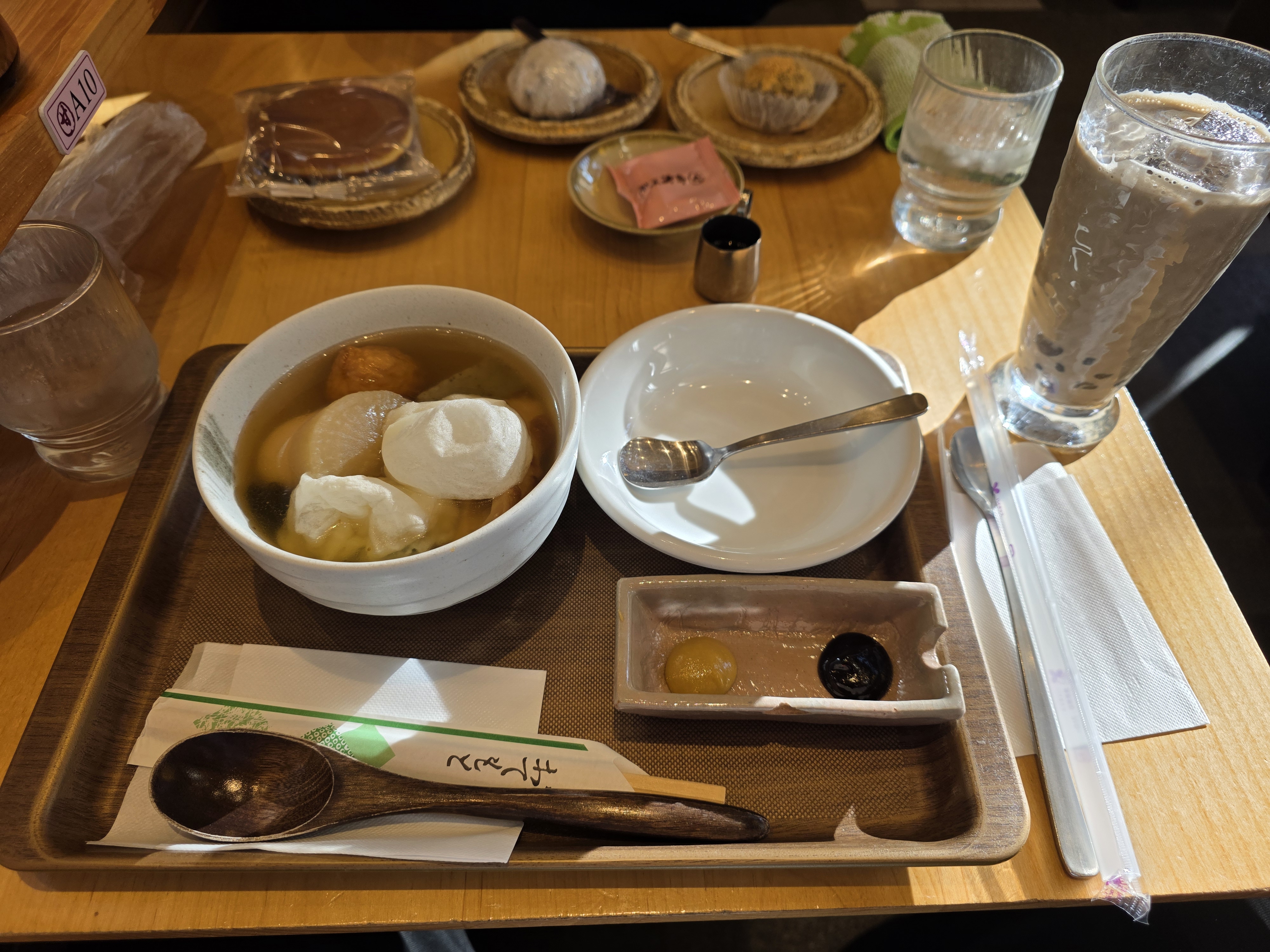 Yesterday we went to Okagean! It seems to be a more upscale Komeda’s Coffee, serving actual food instead of just breakfast bread and sandwiches… I opted to get an oden set and a warabimochi latte. I think warabimochi can sub in for boba pretty well… Maybe this could catch on in the west if someone picks up the idea.