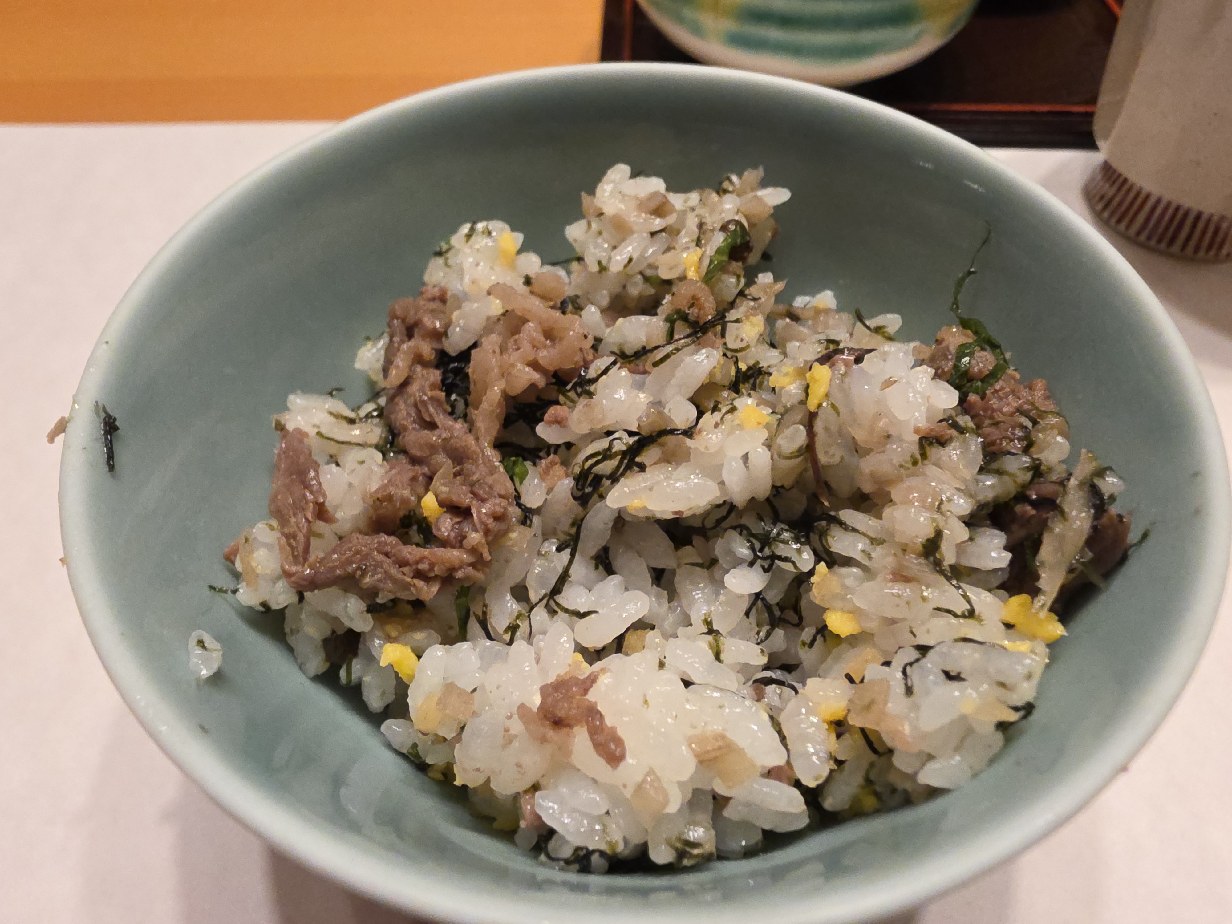 Here is dinner! I was a little worried since there were a few bad reviews of this place, but I think it was quite good. I wouldn’t say it blew me away by any means, but it’s definitely a solid meal and each bite is unique. I don’t know if I could keep eating multiple course meals like this, though. Generally I prefer to just have like a one dish specialty from a restaurant and maybe a fun side dish and have at it, as I think the multiple course little bit of food in a dish is somewhat pretentious. It was a good call to not make any fancy restaurant reservations for this trip in hindsight. Probably the most fun thing was the conger eel and burdock fried in the tofu – I don’t think I’ve ever seen anything like it! The main dish was a bowl of rice and beef, mixed in with vegetables – the vegetables complemented the base rice without the overuse of sauce that one would normally see at a gyudon place like Yoshinoya or something.