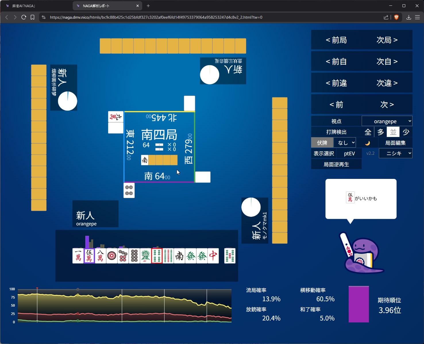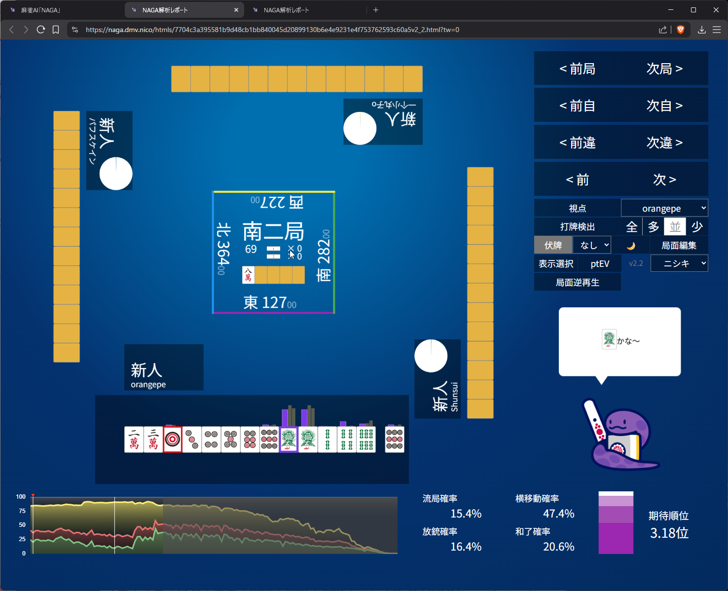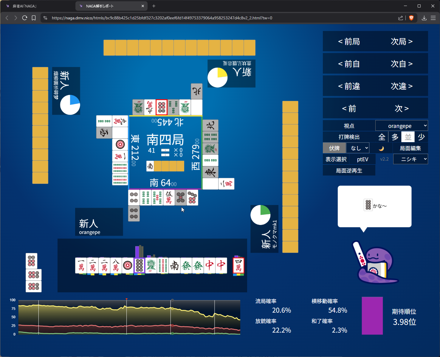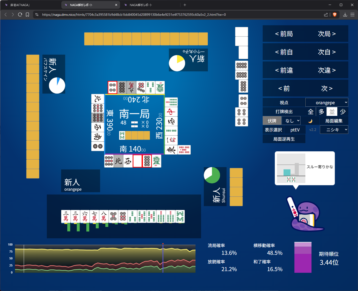 i didn’t like 25m suji anymore after 6m pon so i went with 8s suji on 5s. as expected naga does think 3m suji is more dangerous than 8s and i do have somewhat ‘valid’ fear of 5m to kamicha