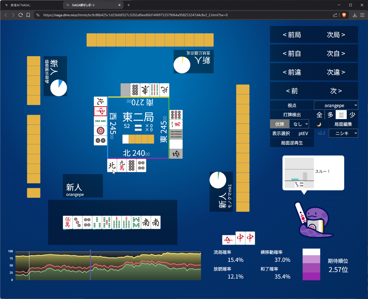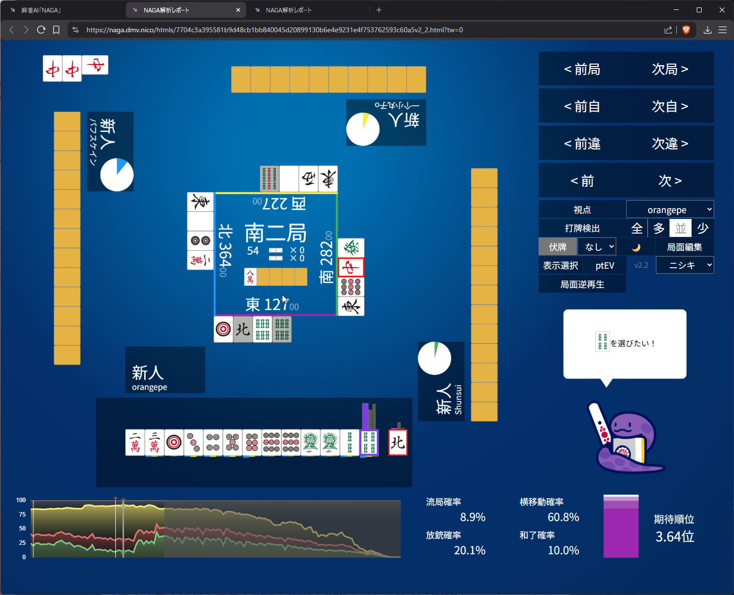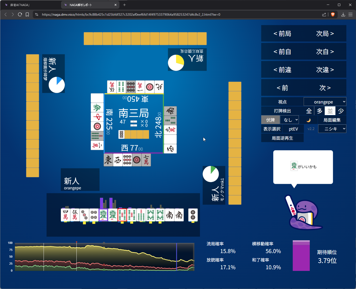 i didn’t like 25m suji anymore after 6m pon so i went with 8s suji on 5s. as expected naga does think 3m suji is more dangerous than 8s and i do have somewhat ‘valid’ fear of 5m to kamicha