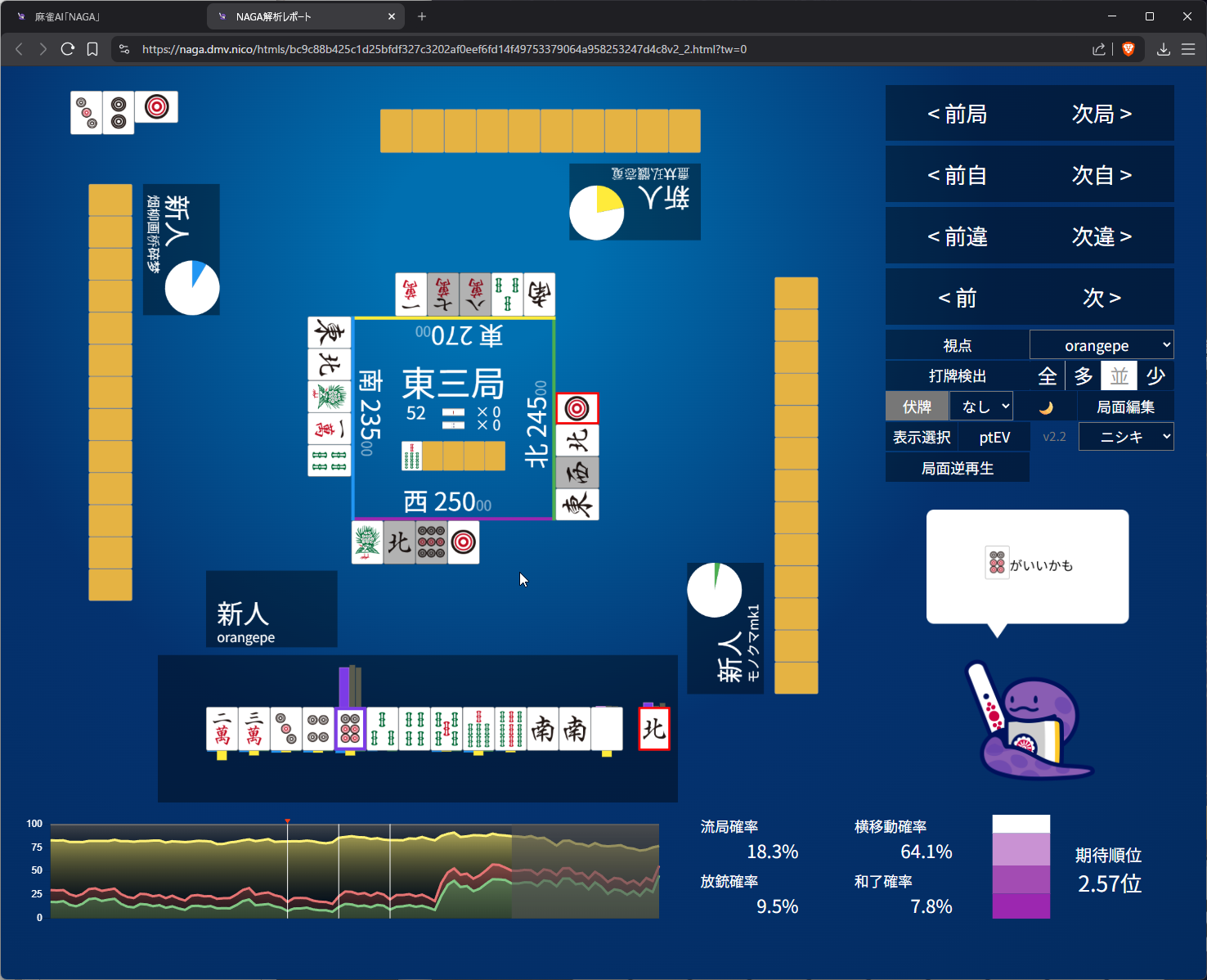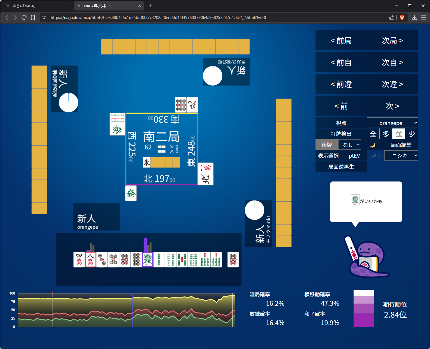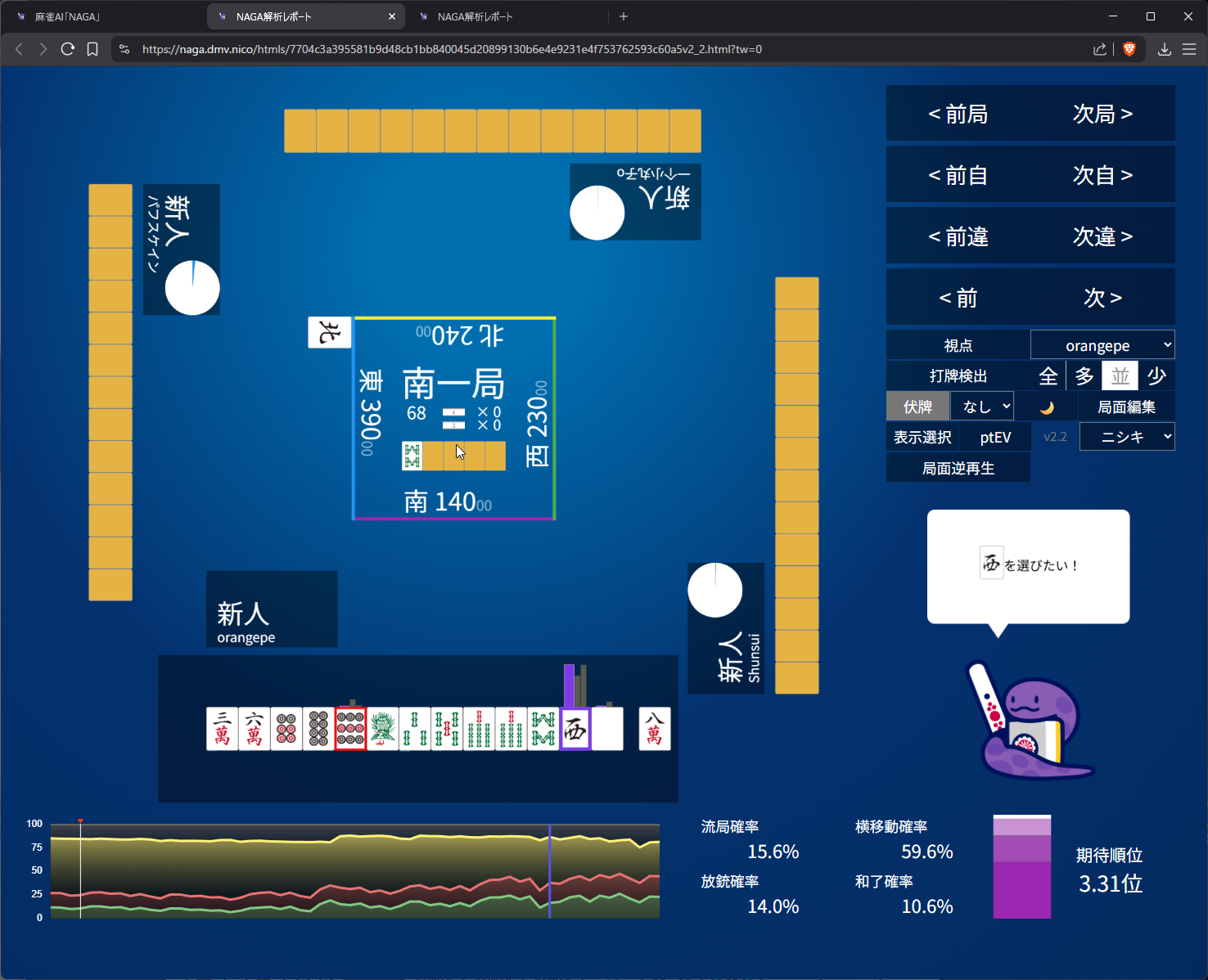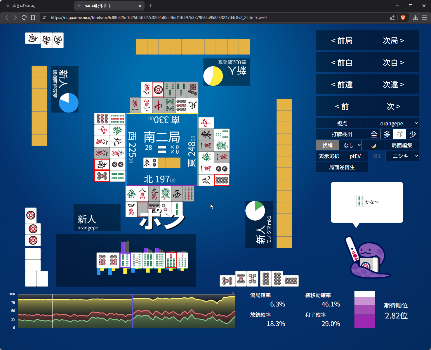 i didn’t like 25m suji anymore after 6m pon so i went with 8s suji on 5s. as expected naga does think 3m suji is more dangerous than 8s and i do have somewhat ‘valid’ fear of 5m to kamicha