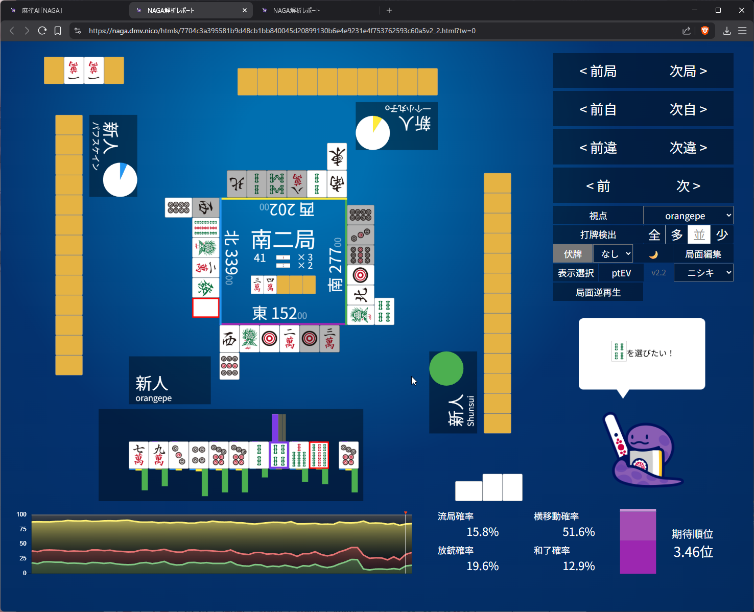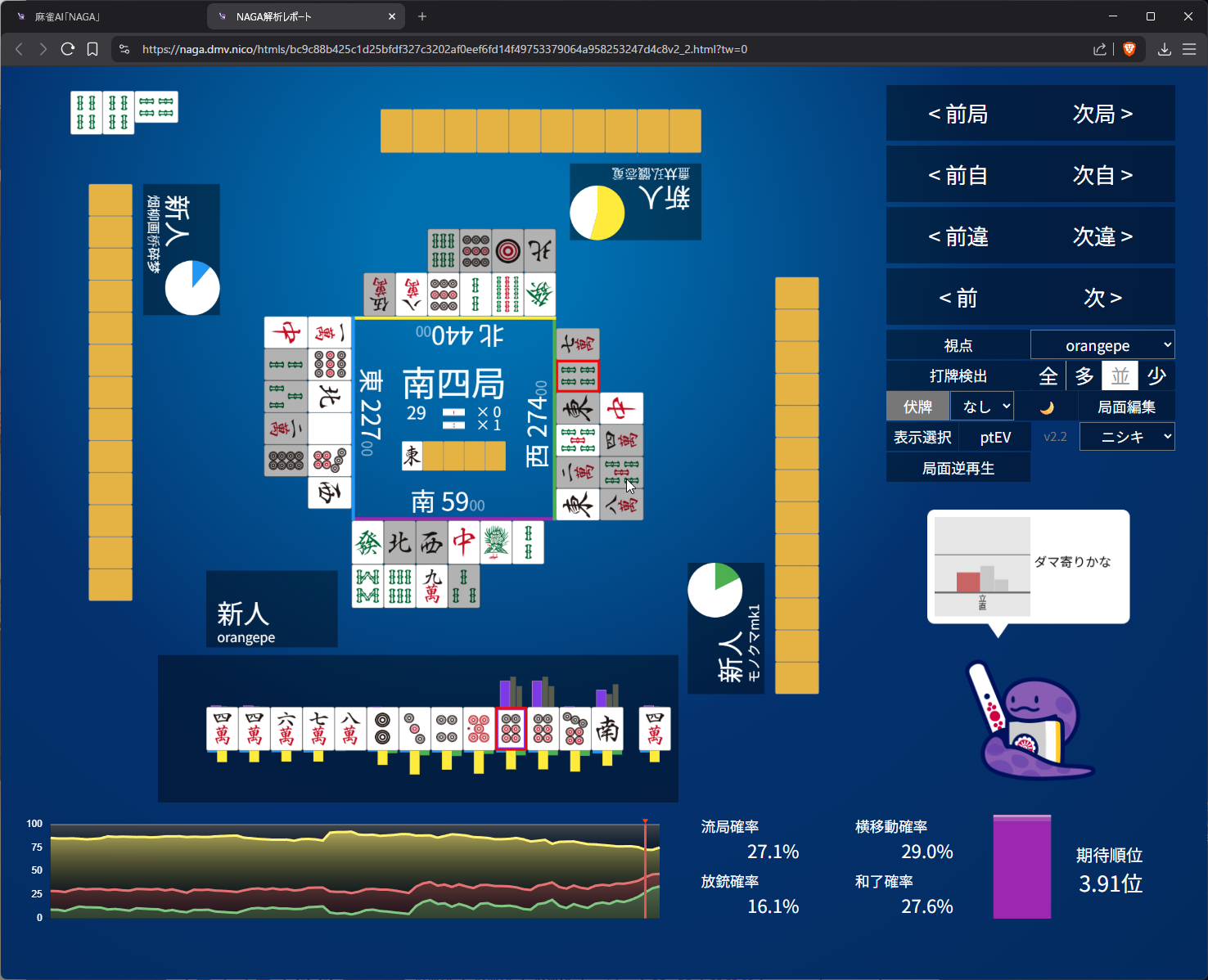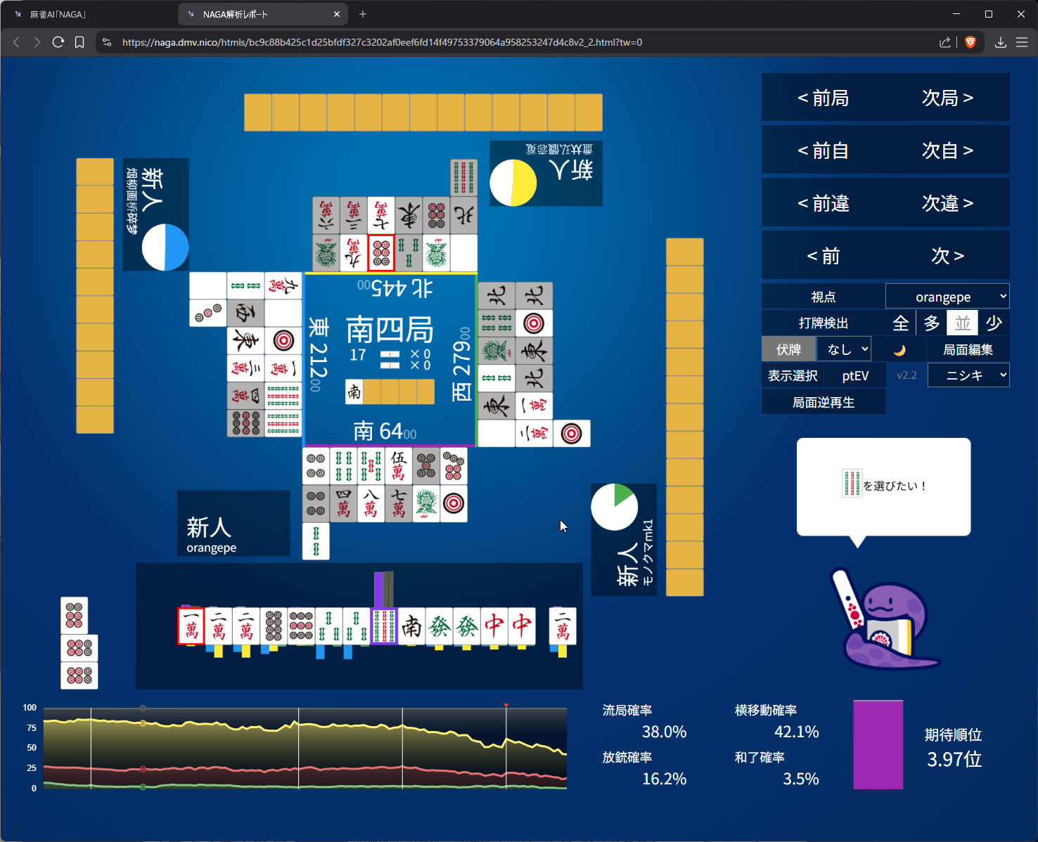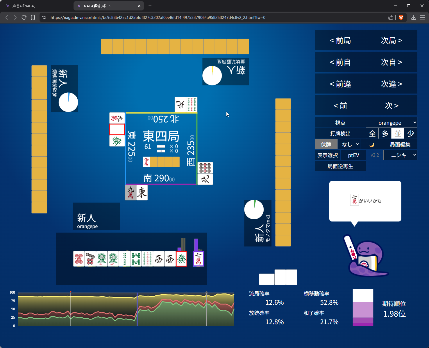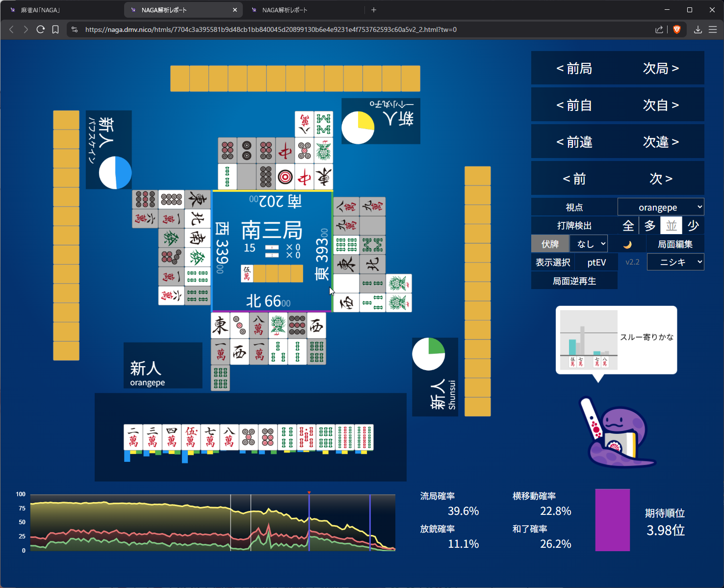 you need value here as 4th in s2 and open tanyao for 1k doesn’t get us anywhere… even the aggressive open snake is 50/50 on it (the right most bar)