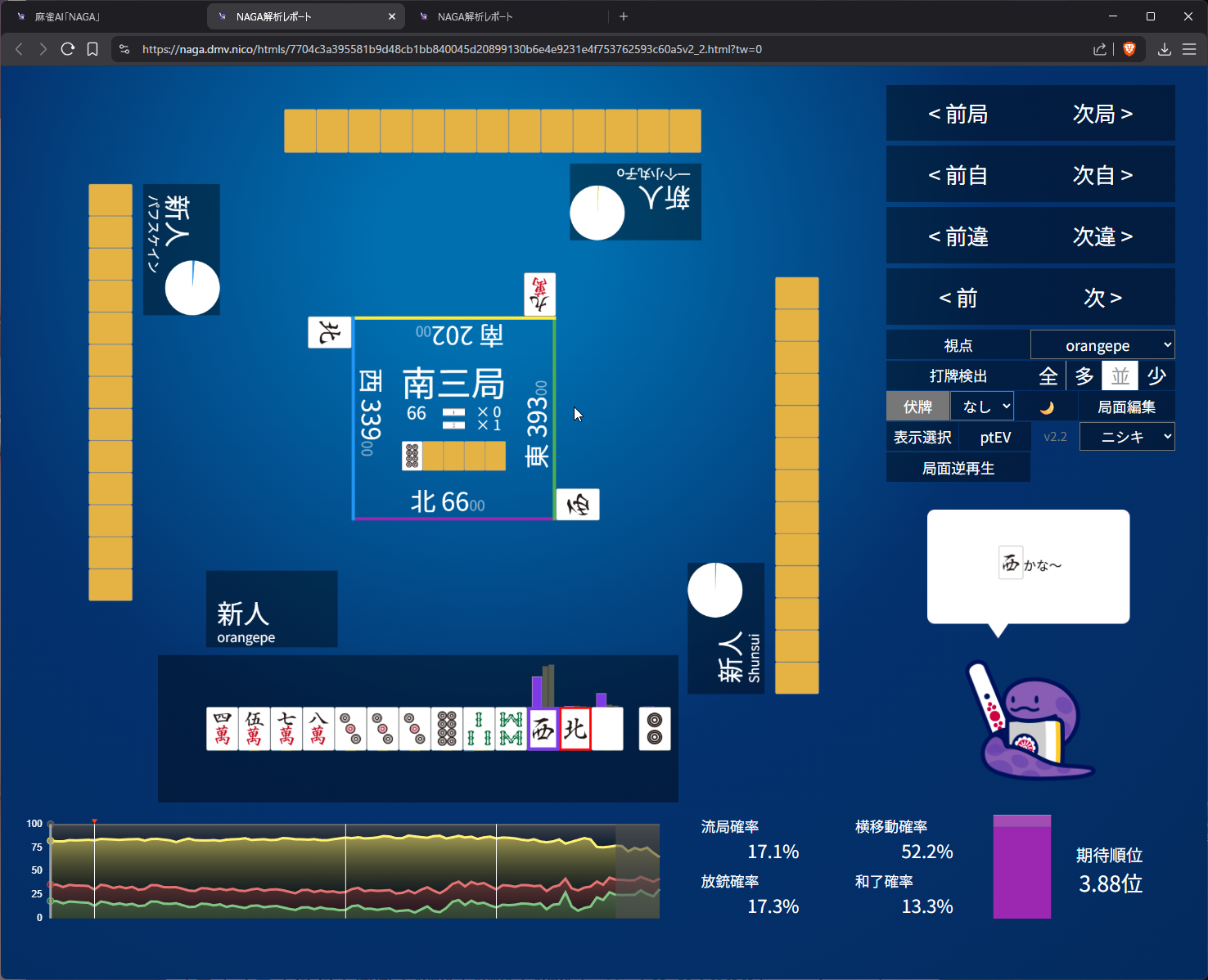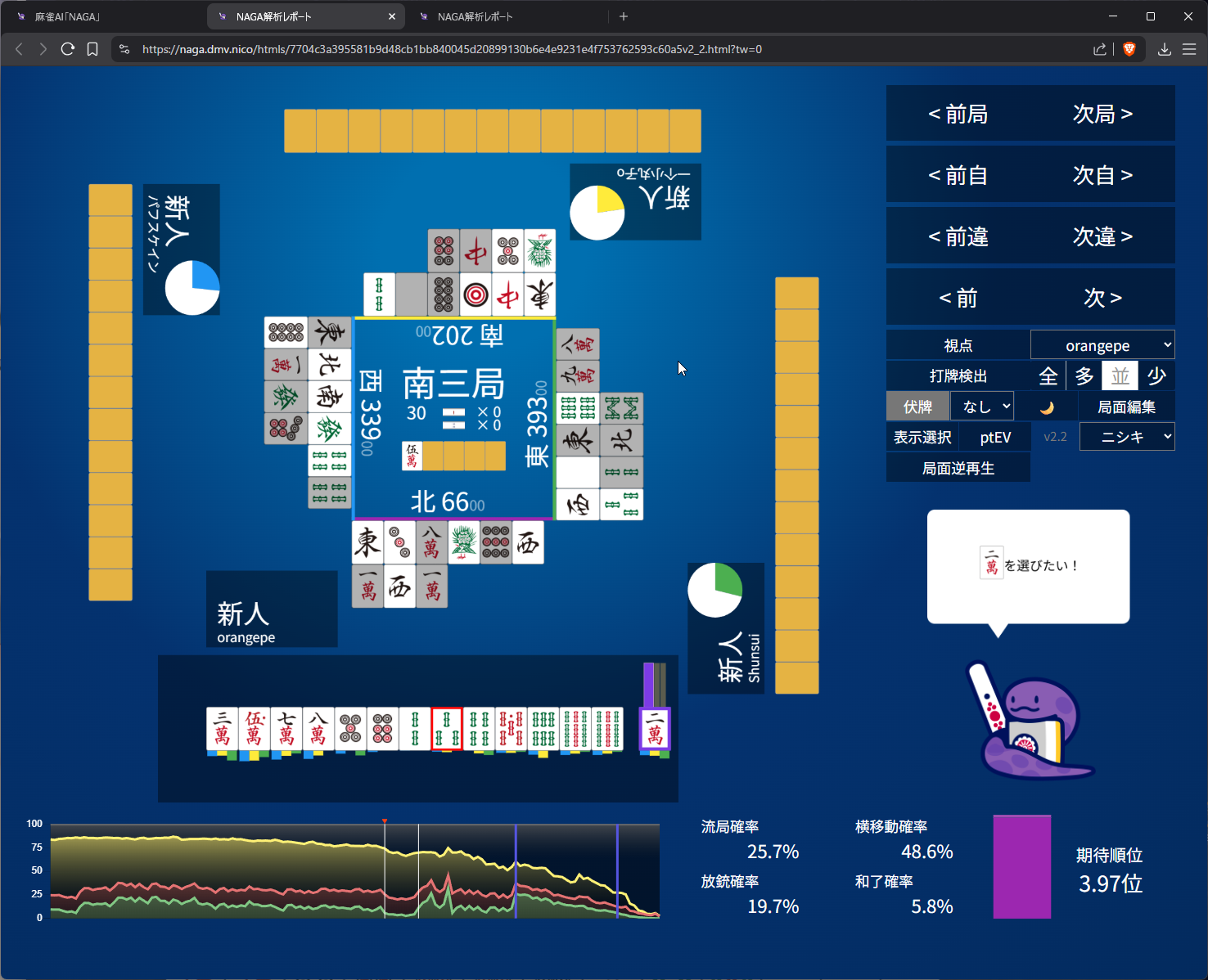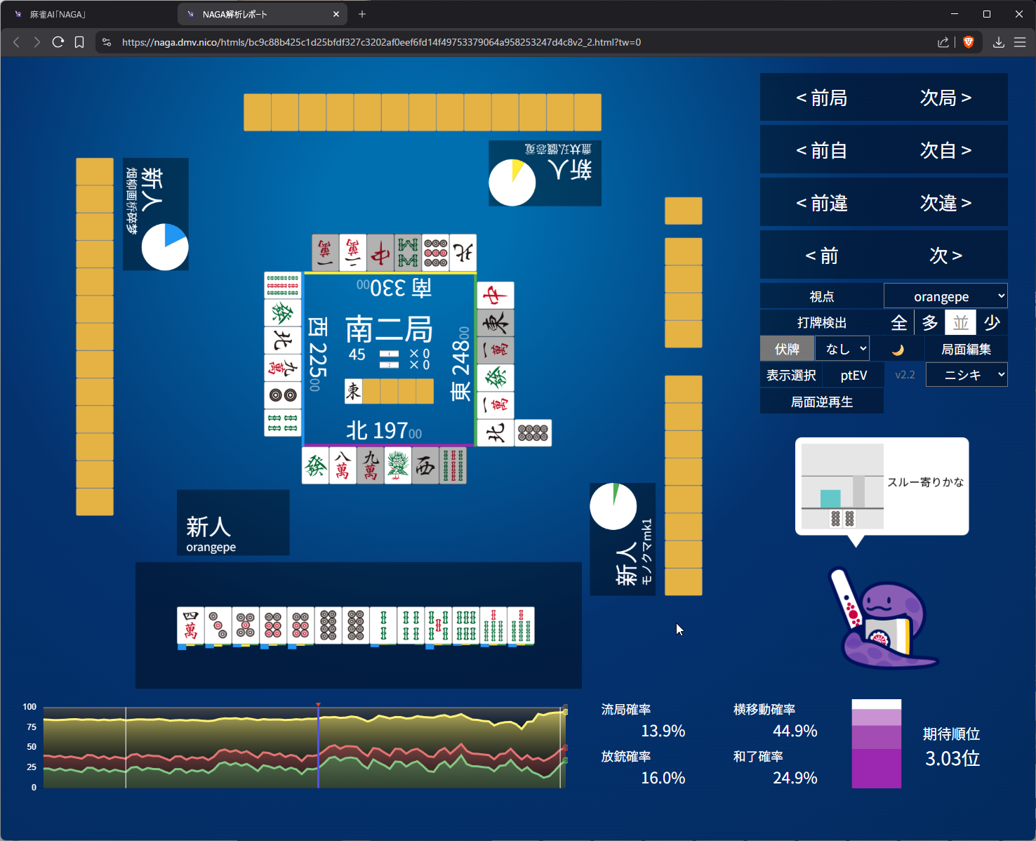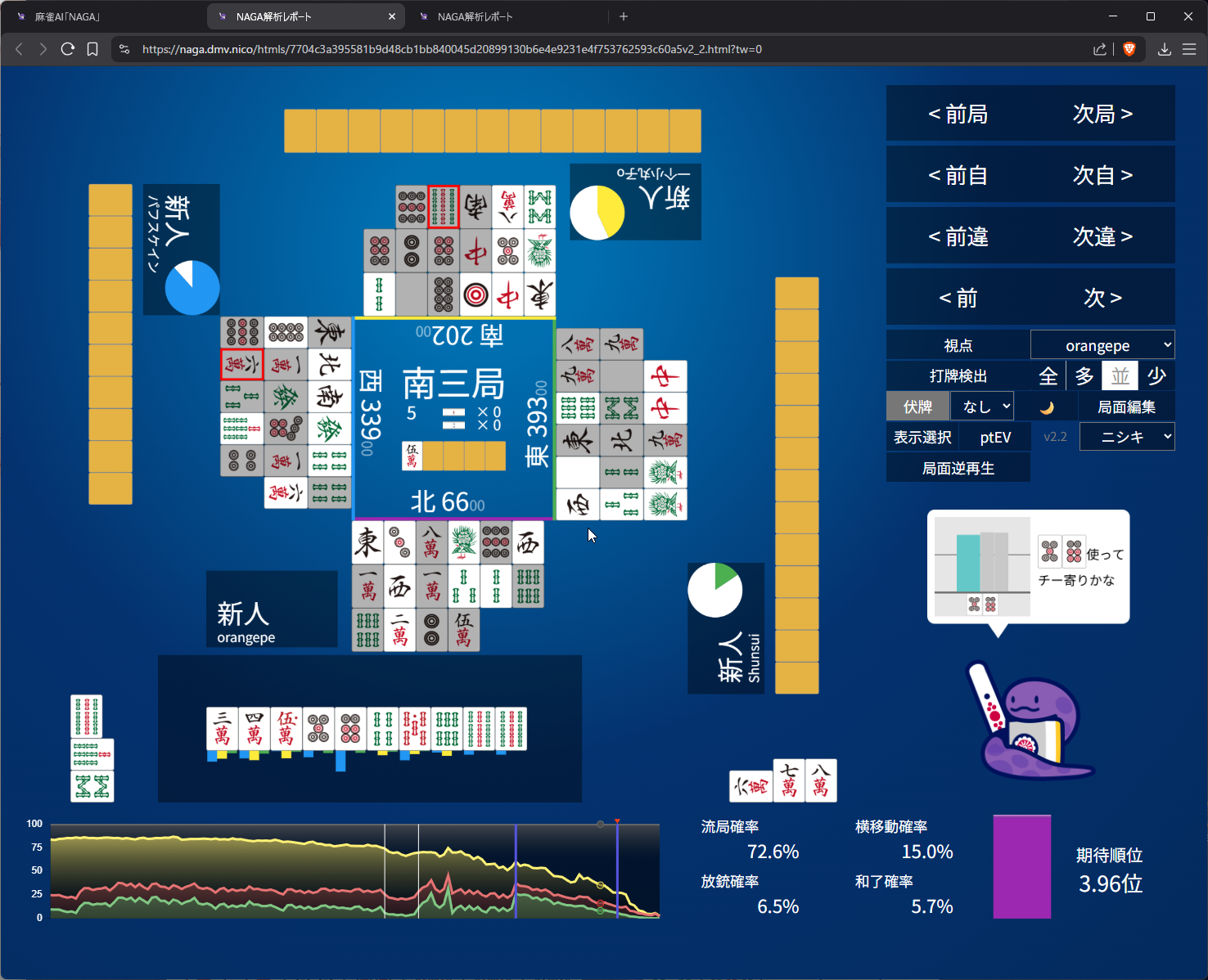 you need value here as 4th in s2 and open tanyao for 1k doesn’t get us anywhere… even the aggressive open snake is 50/50 on it (the right most bar)
