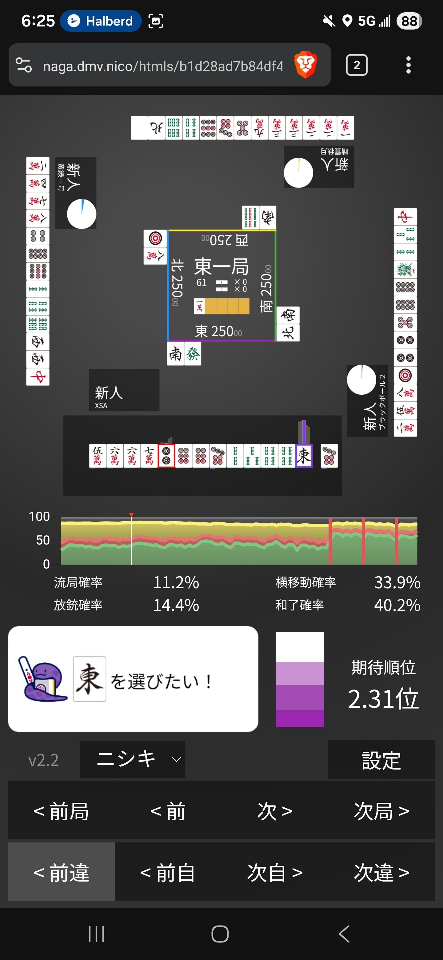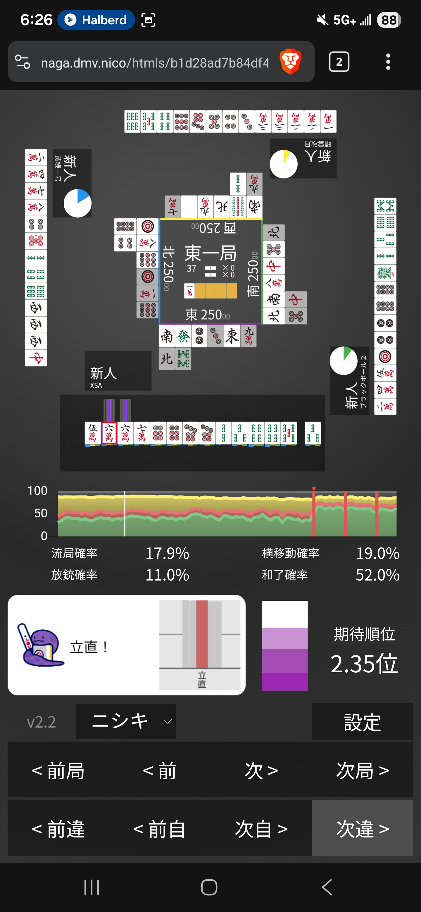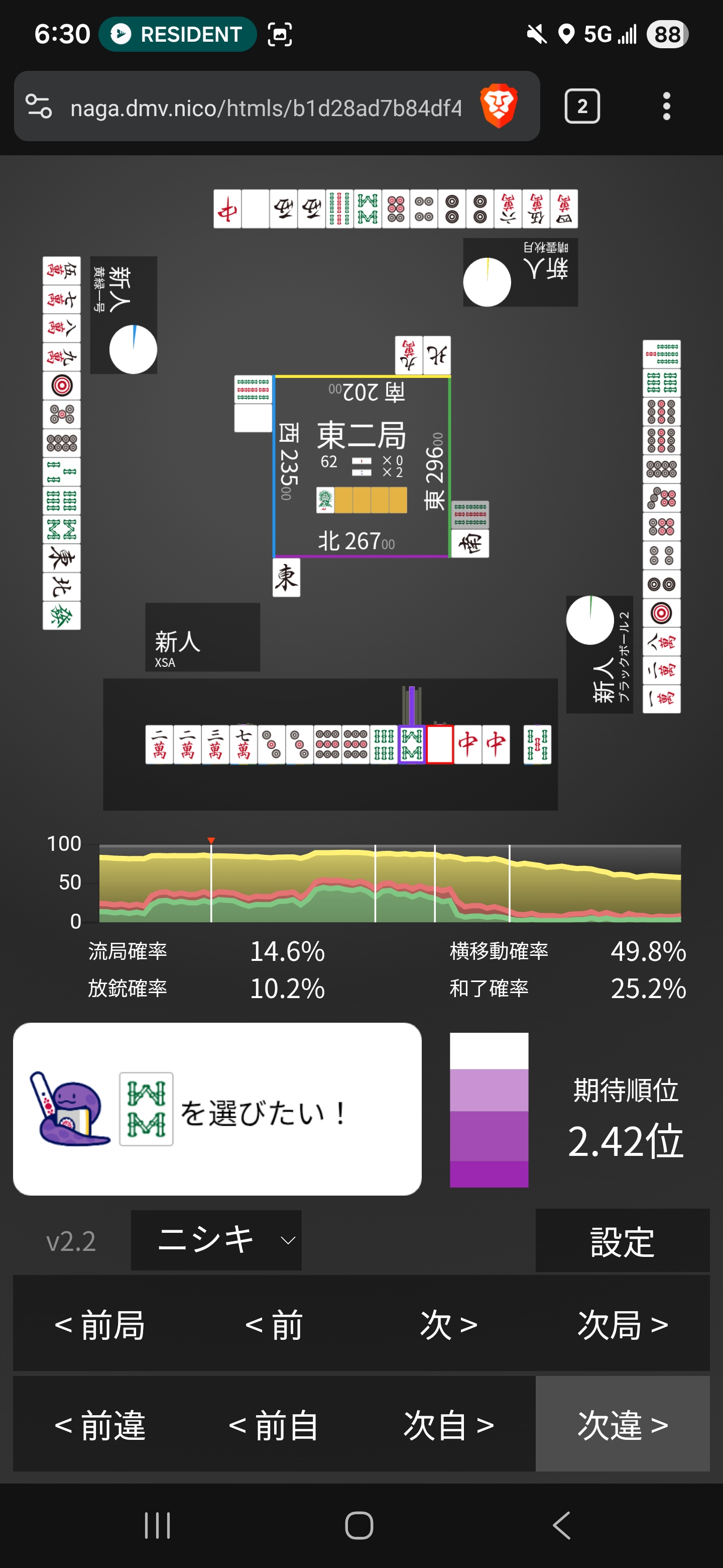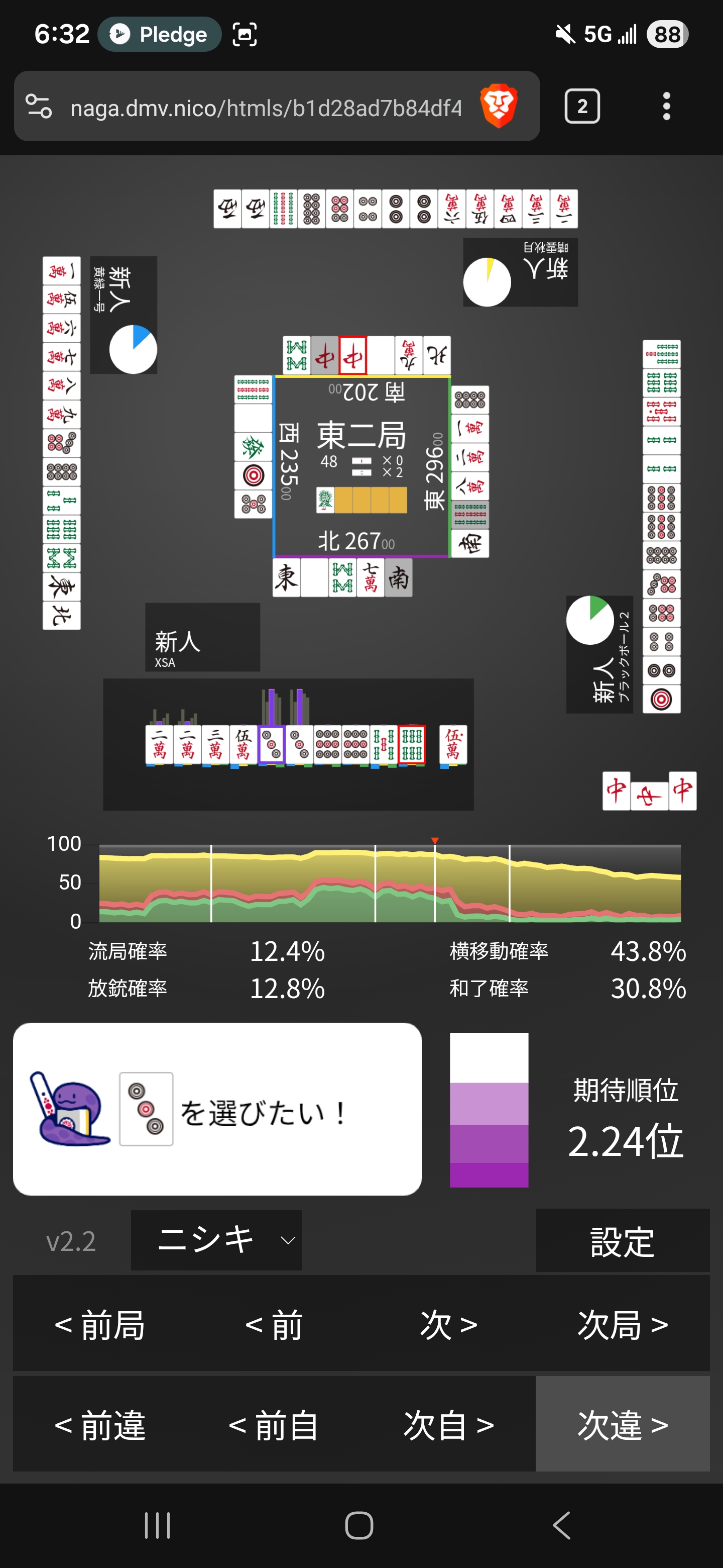 I guess fighting here with 6m tan dora 2 isn’t that strong. Just get tenpai yourself and riichi pin dora 2 instead! ):