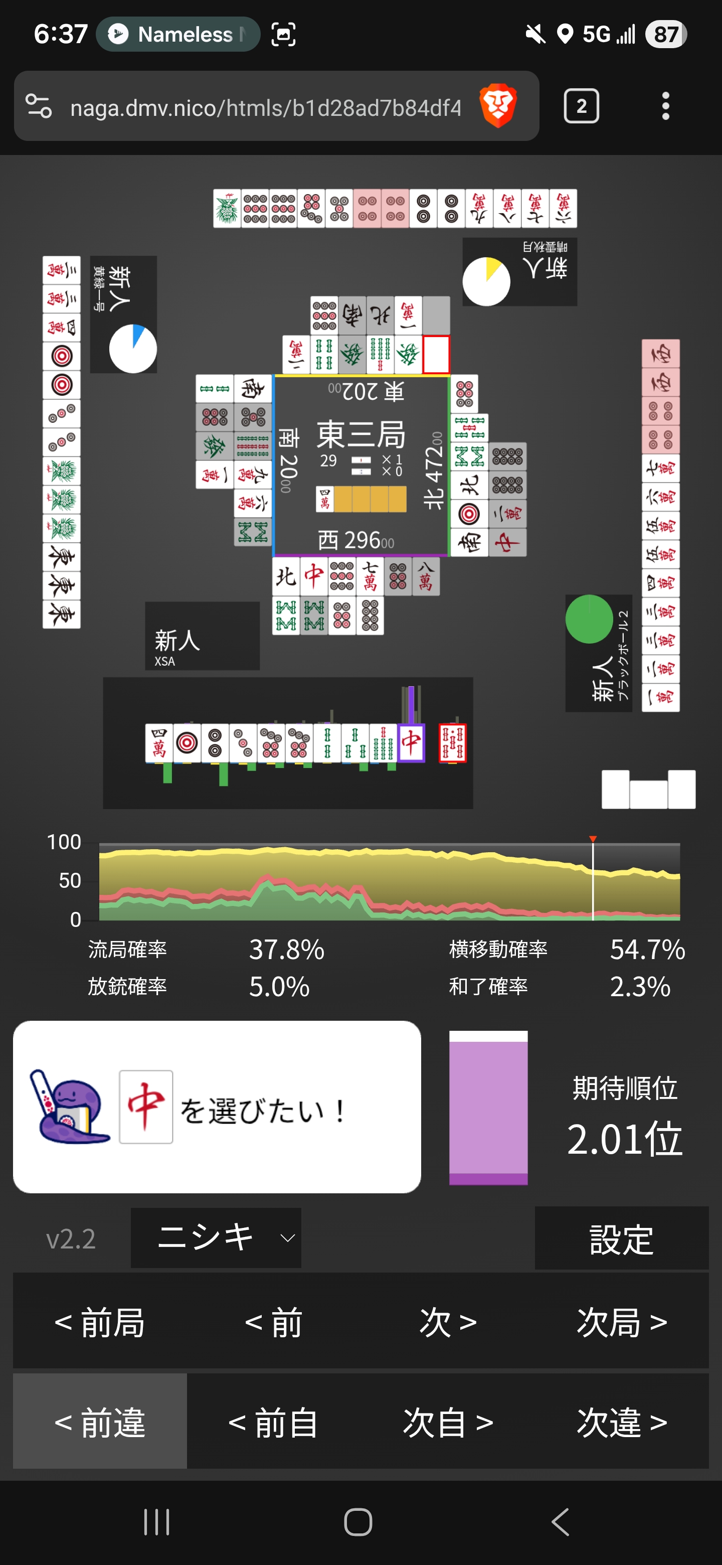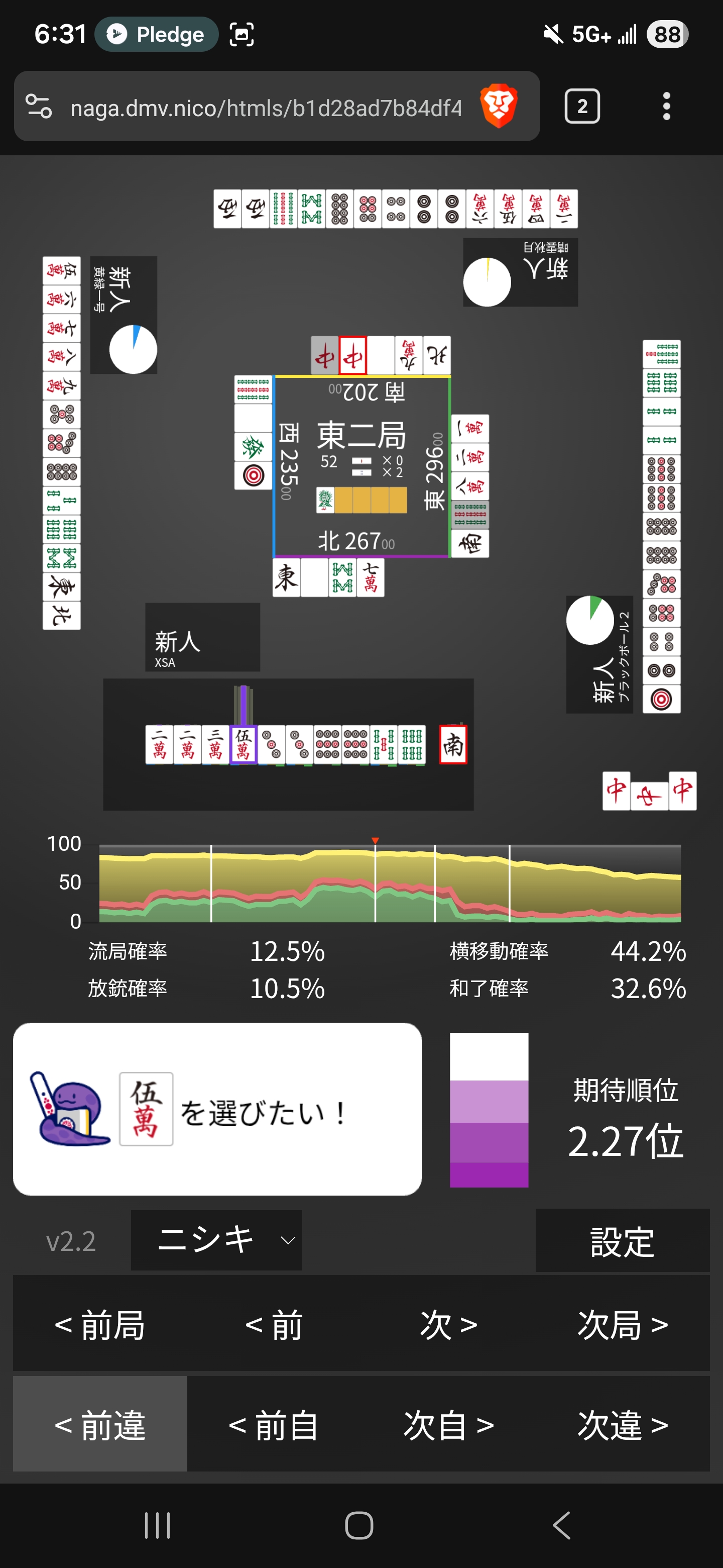 Should have kept this for dama. I can better expand to lower manzu for tanyao to get something like 345666m to keep the san doko alive. I saw this after I discarded 5m lol