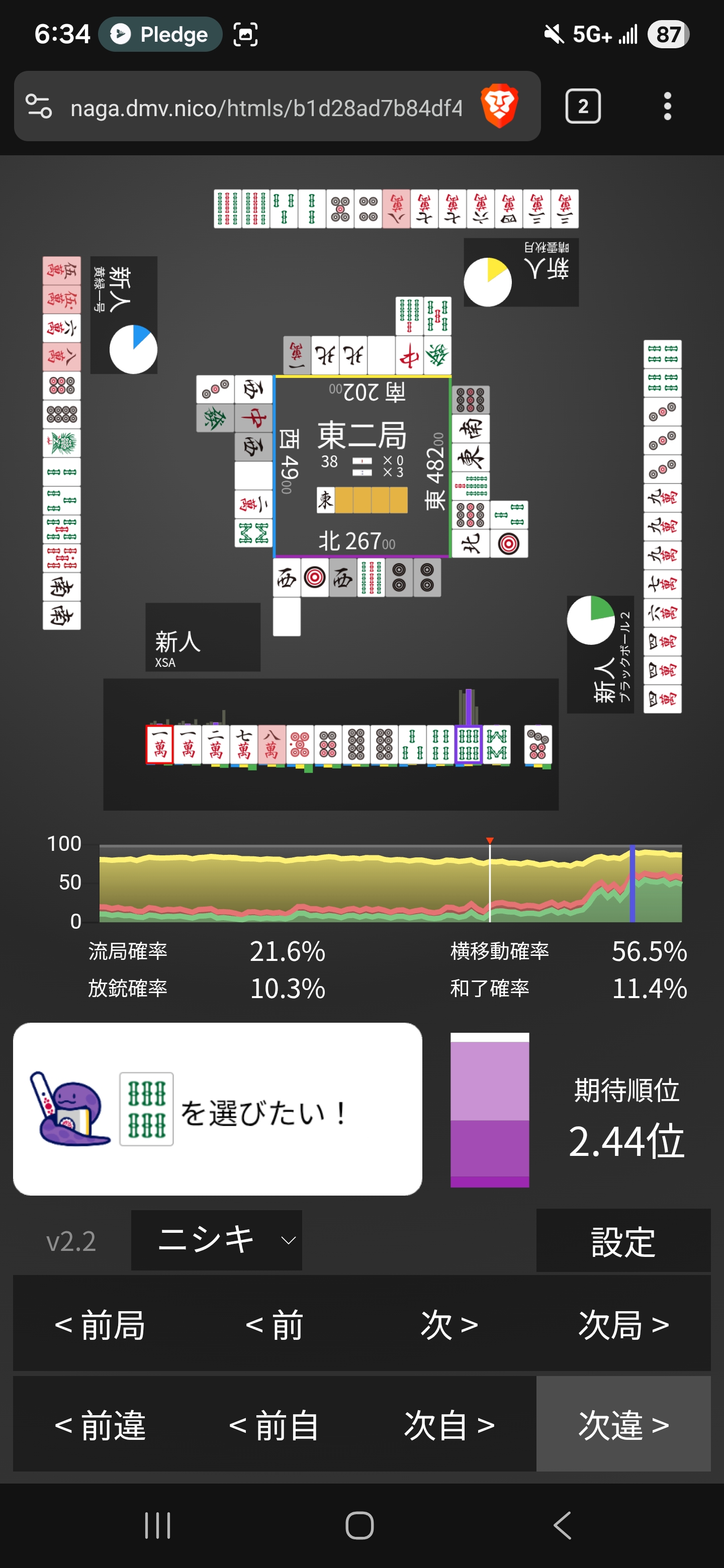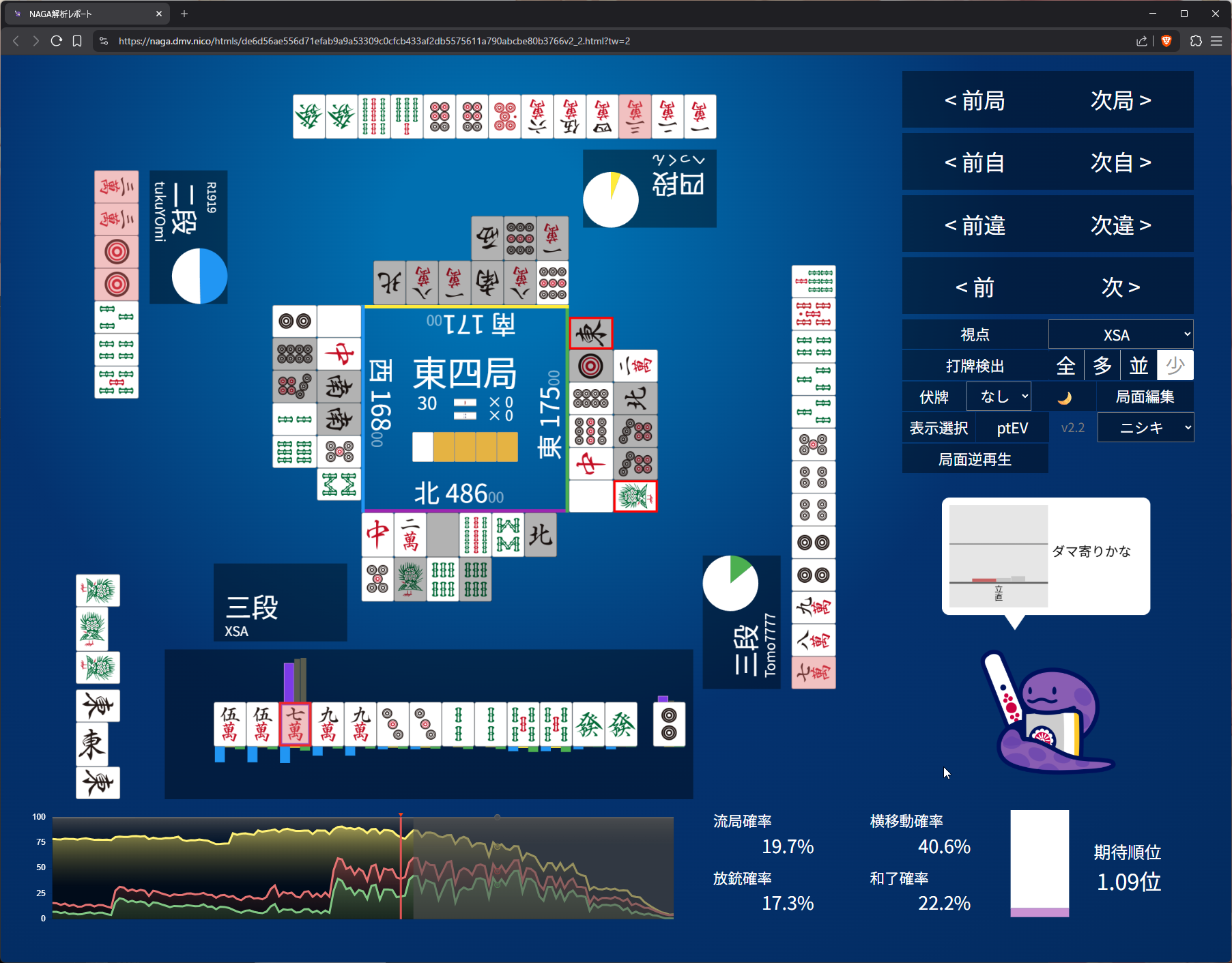 I was thinking I should dama in case I get a dangerous tile (7s?)… but would I actually fold if I drew something dangerous? not like I terribly need more points here but we also do wanna fold against shimocha