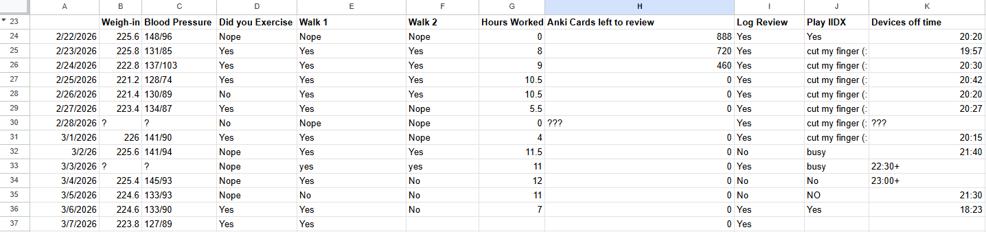 Well we were doing pretty good until I took a break while wfh on friday… then I haven’t logged back on to work or done anything productive since then and have been in a death cycle of dopamine phone browsing and losing in mahjong whee. Losing is more tilting if you don’t have your real life straight, so we should do that first. I think we are good on weekdays at work but because I don’t have structure at home it is falling apart for now. Let’s practice!