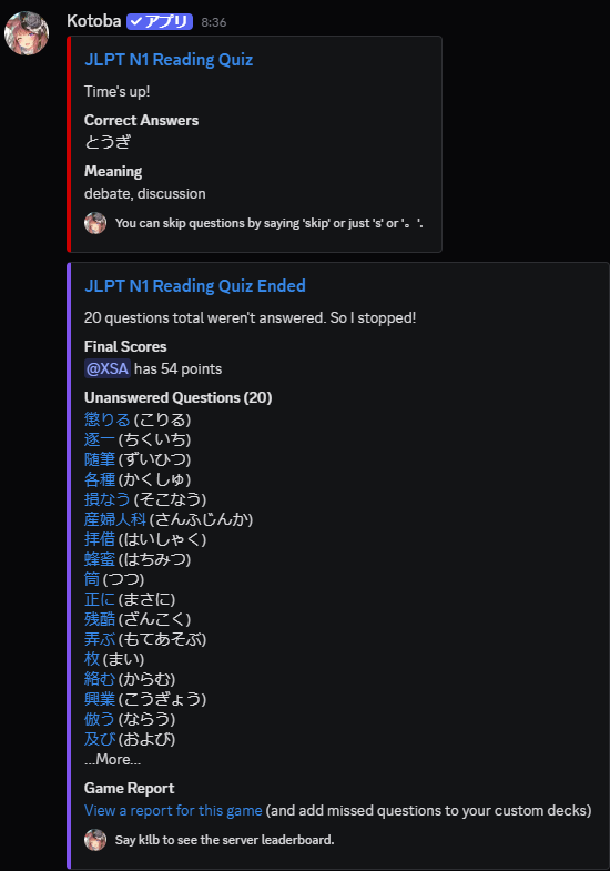 Since I’ve been able to full clear my anki deck, I now have room to be adding cards to my deck. Ideally I’d be adding words I come across in エロゲ/同人誌, but going back to those and looking after the fact is a little annoying… so for now we are just sticking with words I miss from Kotoba Bot’s N1 reading quiz: