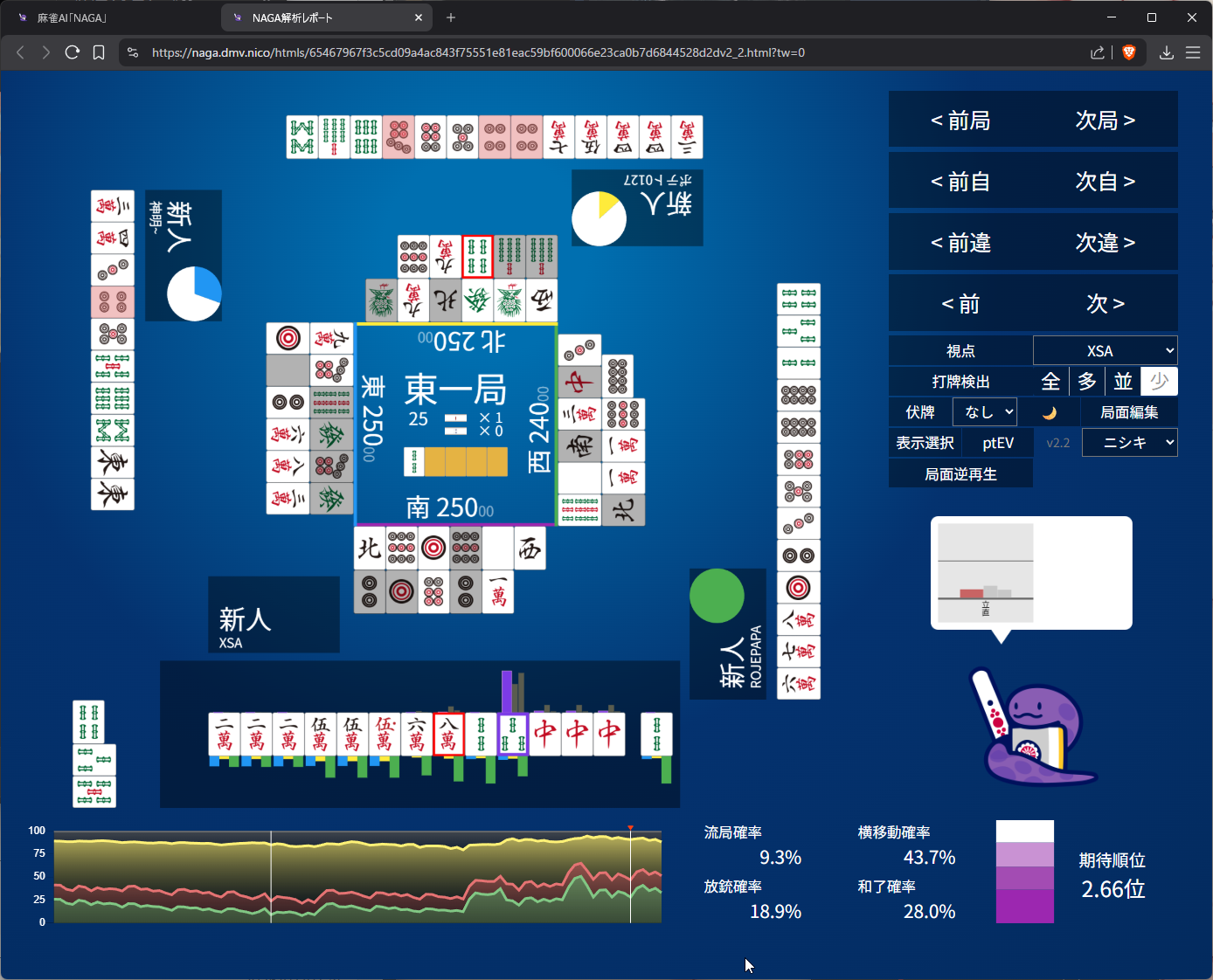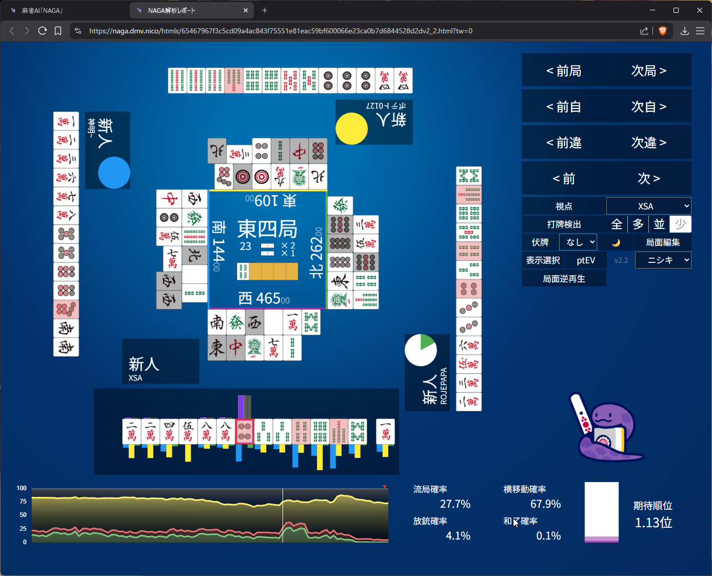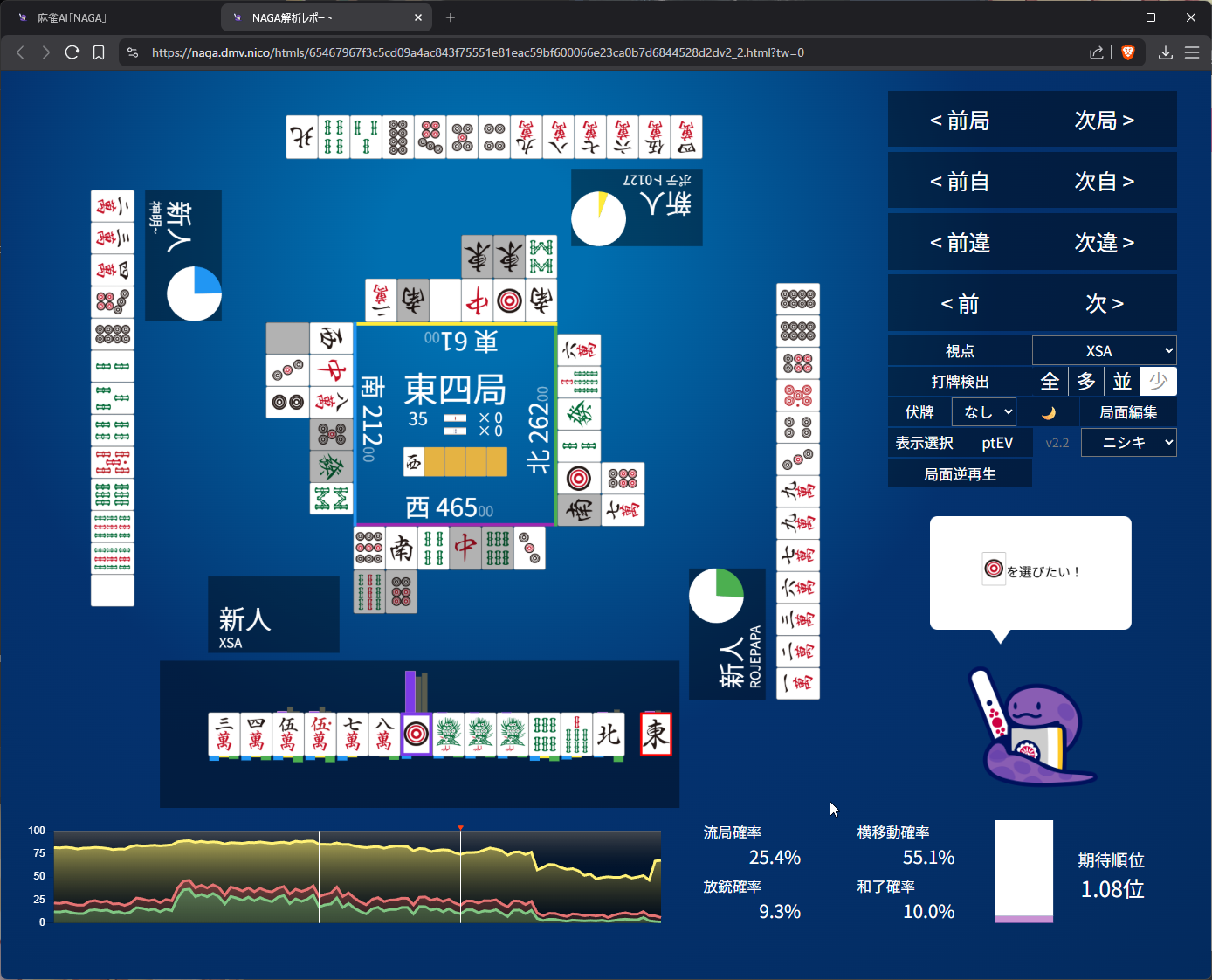 this is interesting that naga thinks 4m is safer than 9m… the only reason I really picked 9m is because every other tile is bad and keeps me in tanyao if my draws improve if i catch 3s or something to move into tenpai. so, only from a pure offensive point of view did i opt for 9m. let’s call it…… dumb luck?