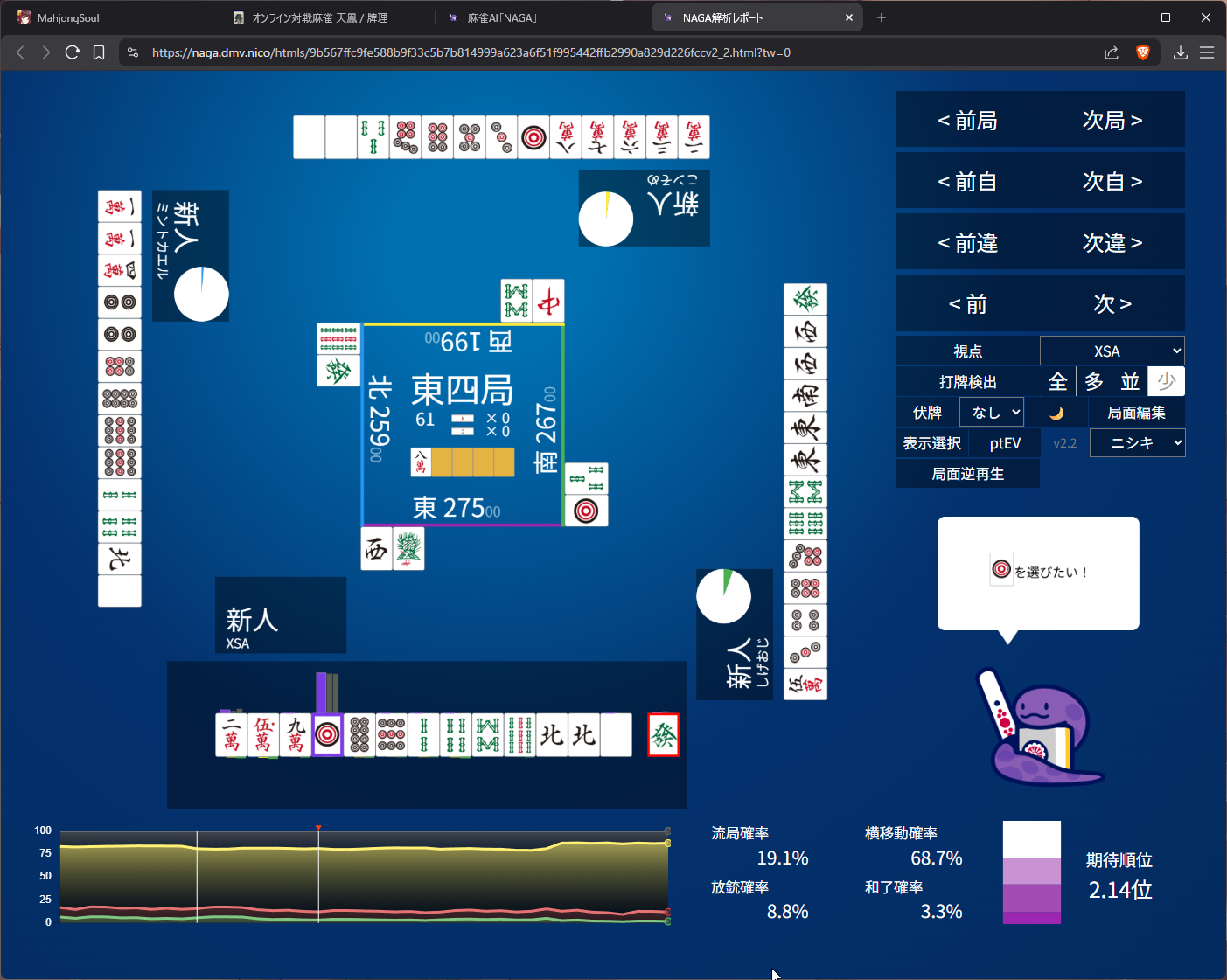 if i break 22z I’m… 2 shanten to fighting with maybe pinfu dora? not a big fan of this at 4.2% agari rate per naga tbh. 2z is likely pretty safe but i don’t feel like i need to test the waters just yet. thanks kagashi for having my back