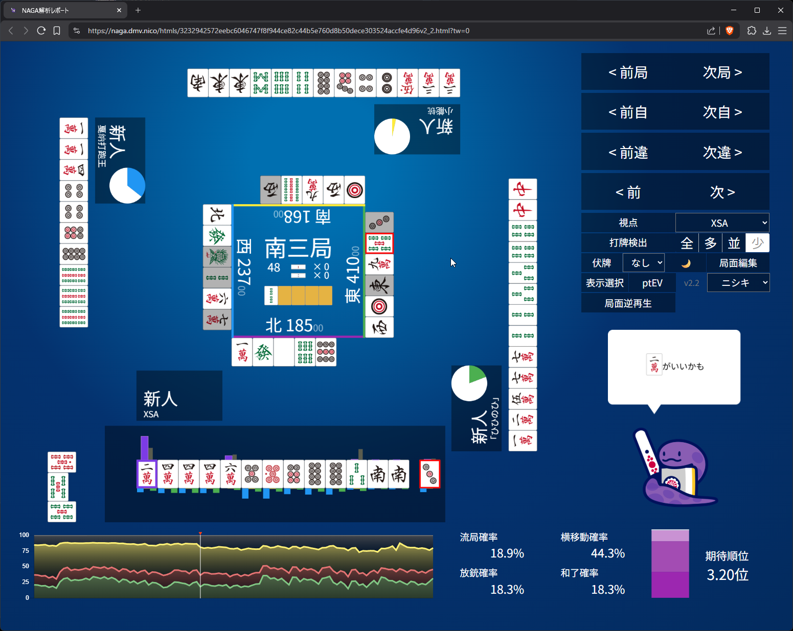 I think in a fuck everything full offense world I’d chii and toss 2s but I was extremely weary of toimen having something like tanyao dora akadora in hand. I know it’s not dora 3 since 3s wasn’t ponned on the 3s discard by kamicha but I really didn’t wanna take another 3900 pt hit here so I let it slide.